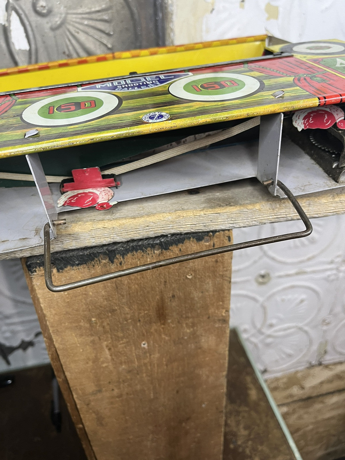 The 1930s Wyandotte Model Toy Shooting Gallery is a vintage collectible tin litho toy from the brand Wyandotte. This toy features a shooting gallery design that is reminiscent of the 1930s era, making it a unique and nostalgic piece for collectors of vintage and antique toys. The tin litho material used in the construction of this toy adds to its charm and authenticity as a true vintage artifact from the past. Perfect for enthusiasts of vintage toys, this Wyandotte Shooting Gallery is a rare find that captures the essence of toy-making from the early 20th century. Belt missing on back, needs a new track for the ducks but does turn,excellent graphics ,11” high by 14” w.