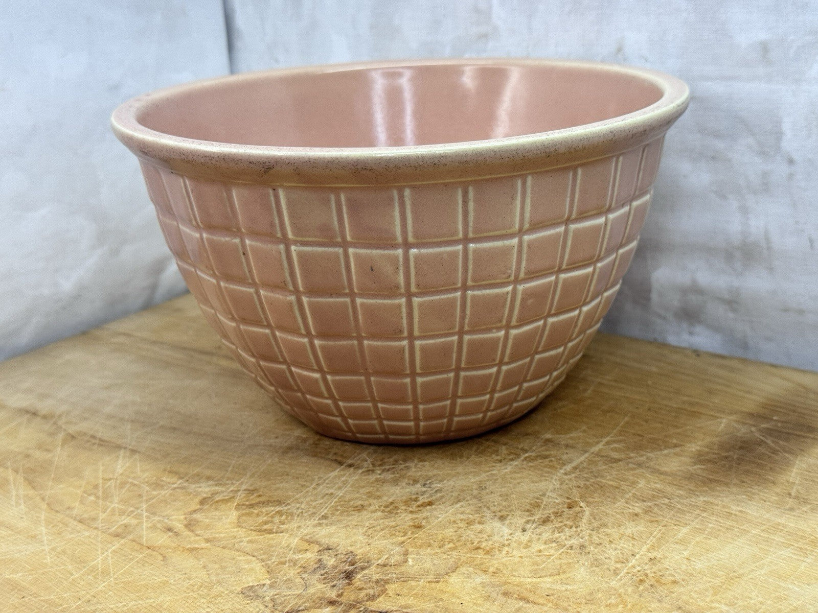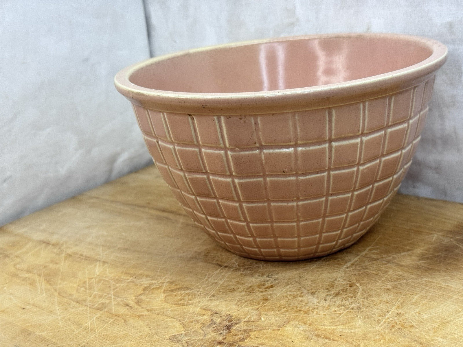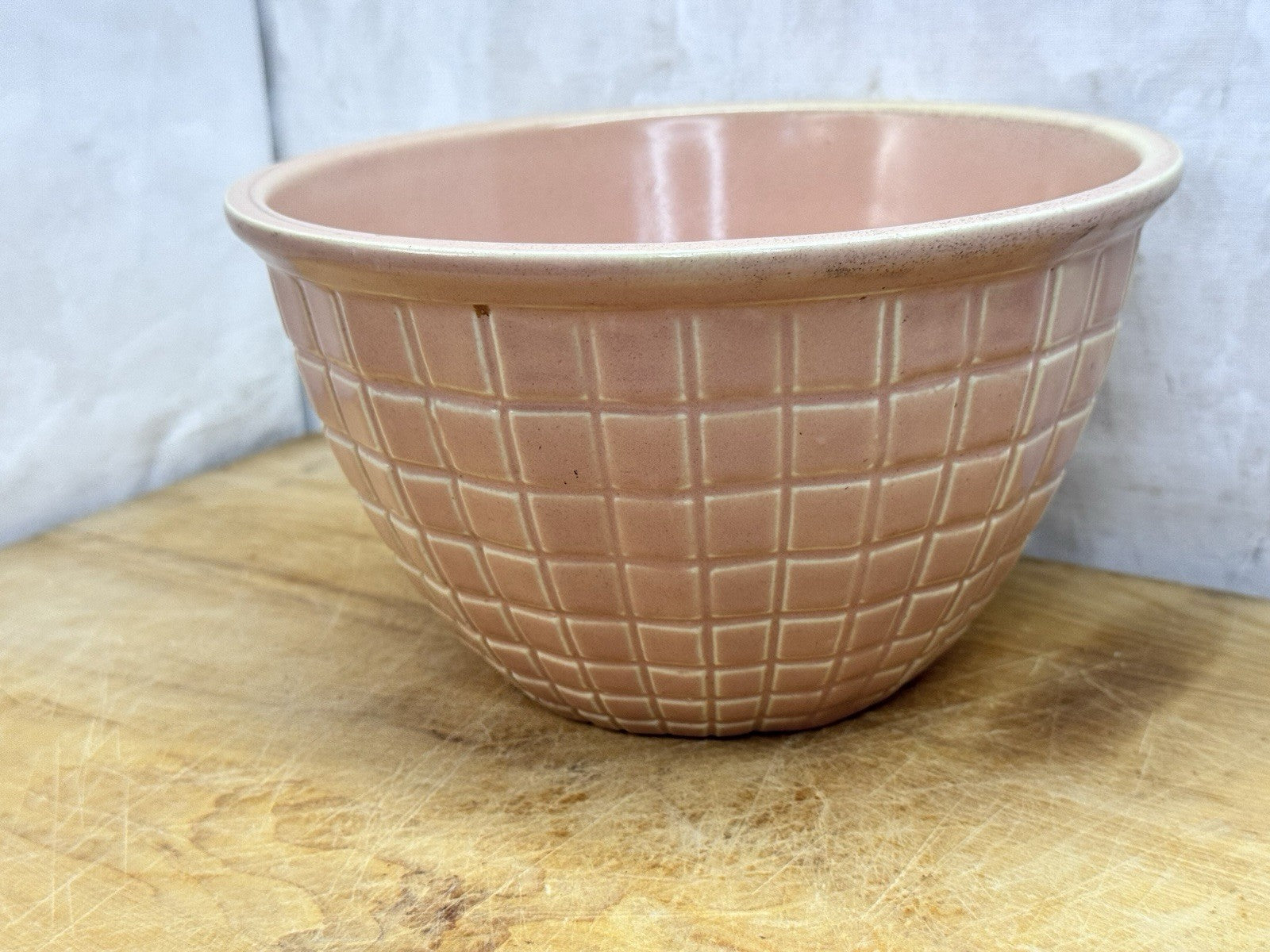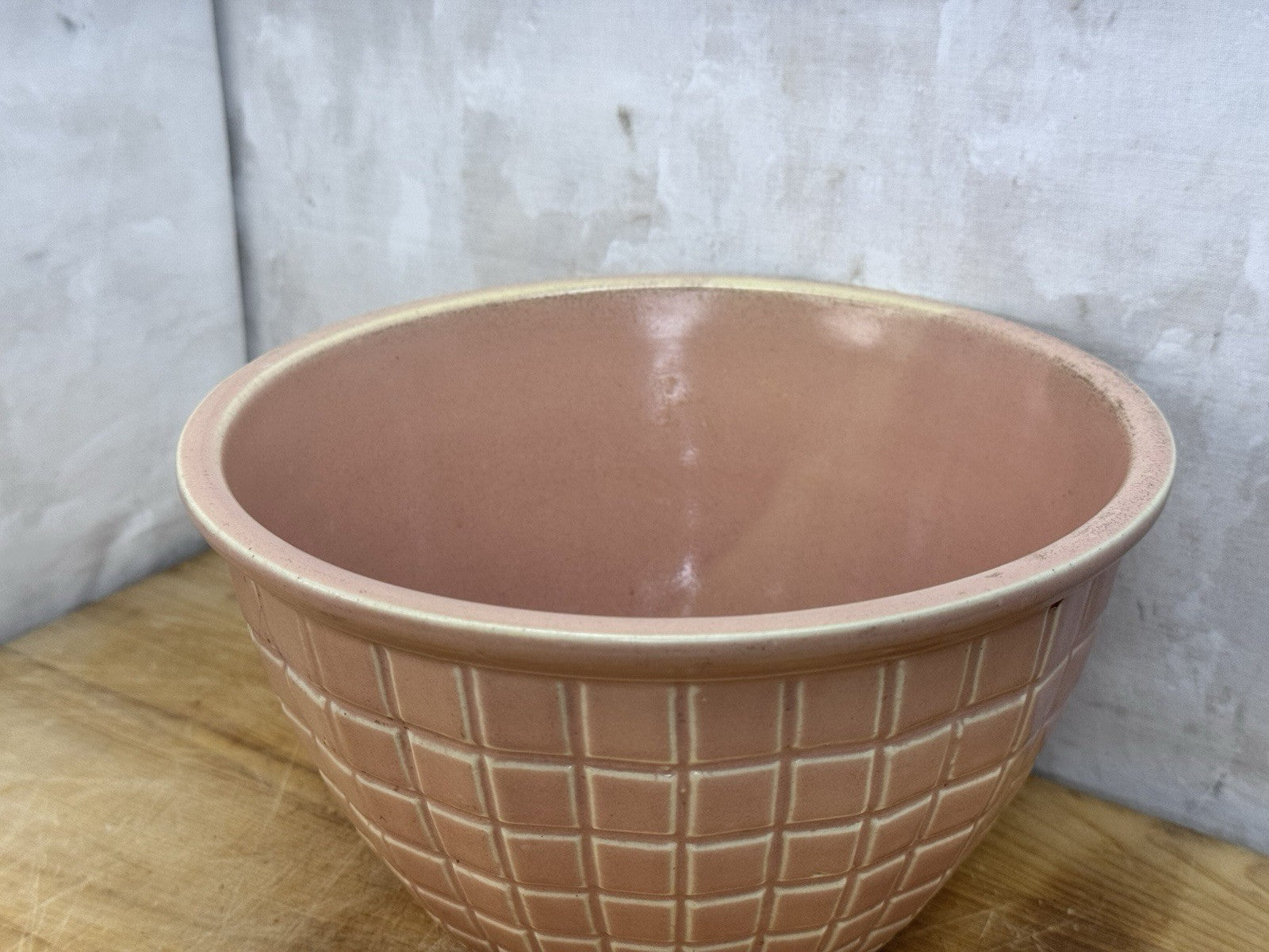 The product is a 1940's Robinson Ransbottom Pottery Roseville pastel pink glazed mixing bowl. This vintage bowl is crafted from pottery using a production technique that reflects the quality and style of that era. The soft pink color adds a touch of charm to any kitchen or dining area, making it both functional and decorative. Perfect for mixing ingredients or serving snacks, this bowl is a unique addition to any collection of vintage cookware or dinnerware. Excellent condition no chips or cracks