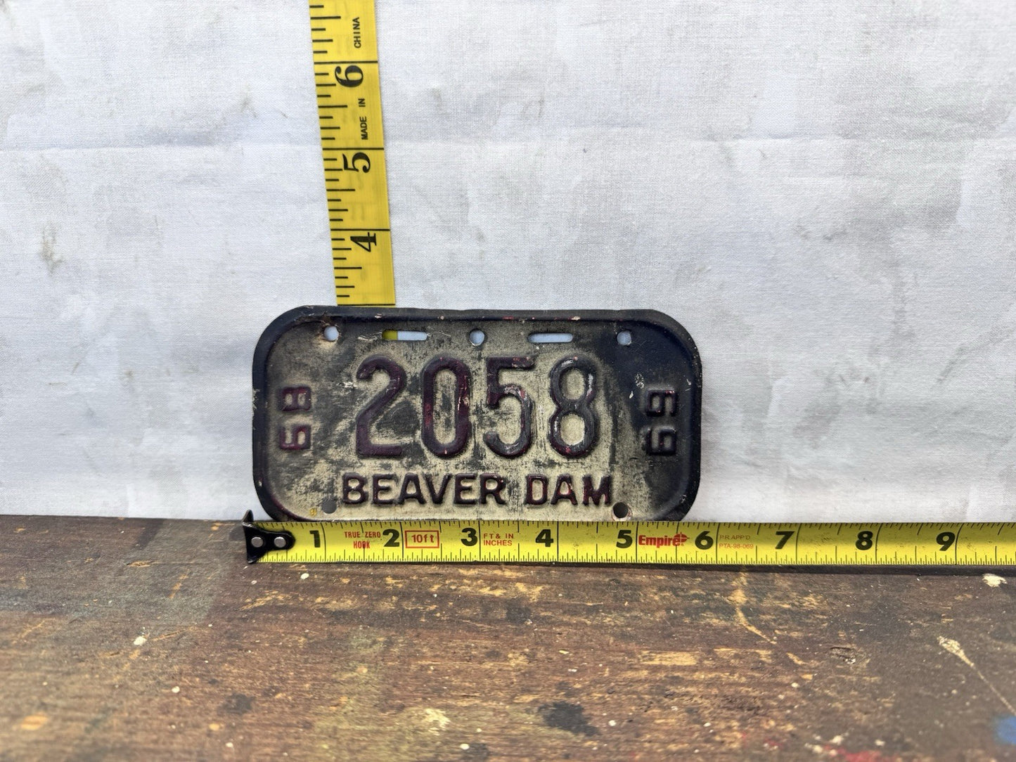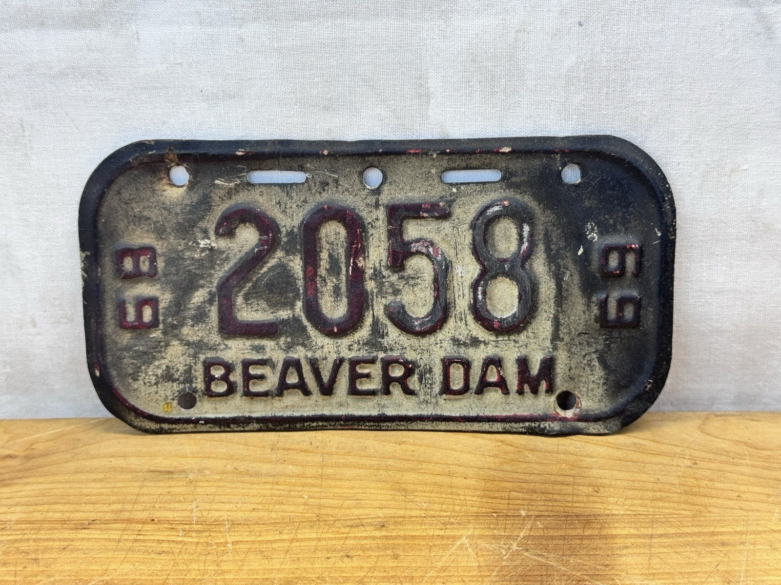 The product is a vintage 1968-1969 Beaver Dam, Wisconsin bike license plate. This collectible item is a piece of automobilia from the US state of Wisconsin, specifically from the town of Beaver Dam. It serves as a nostalgic and unique piece of transportation history, perfect for collectors or enthusiasts of vintage license plates or memorabilia from Wisconsin.