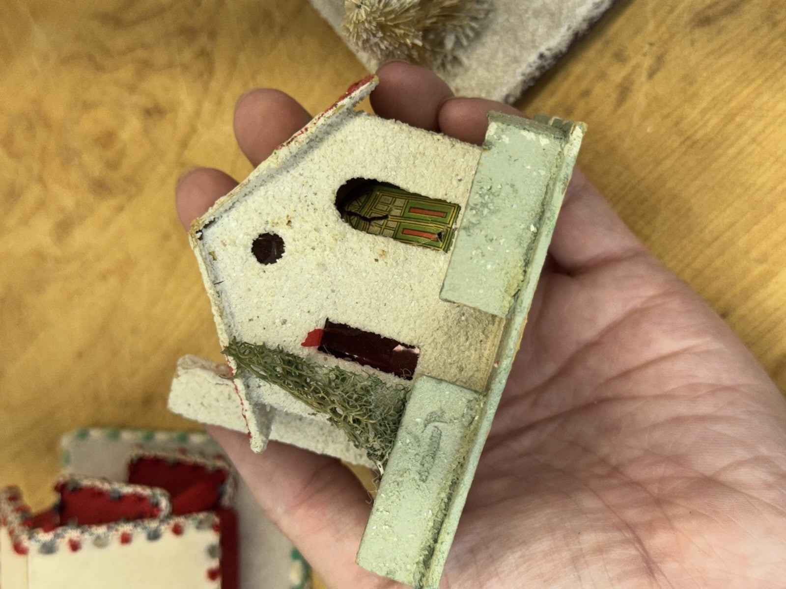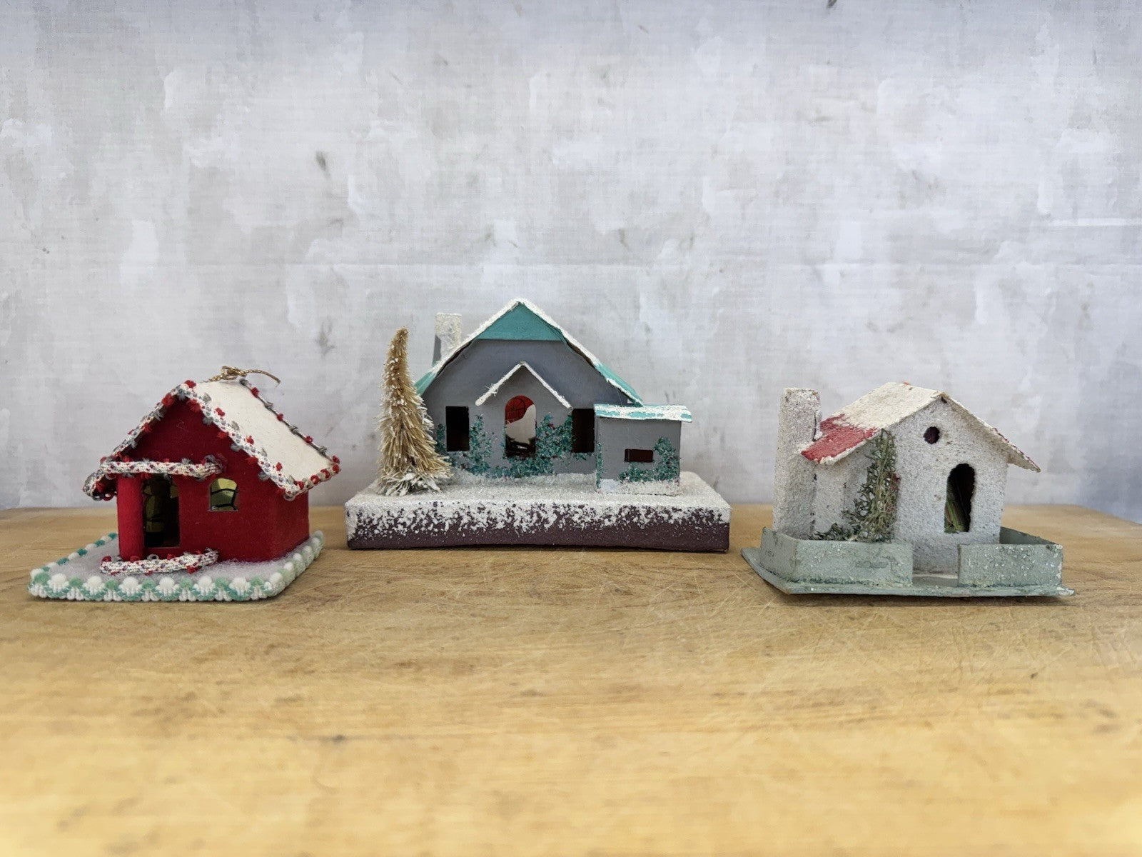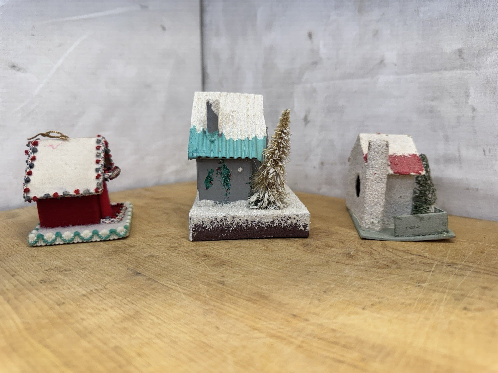 The product is a set of three miniature PUTZ houses originating from Japan. These charming houses are part of a village or holiday display collection, perfect for adding a touch of Japanese craftsmanship and allure to any seasonal decor. Made with attention to detail, these houses showcase the rich cultural heritage and artistic flair of Japan, making them a unique and delightful addition to any holiday or seasonal display.