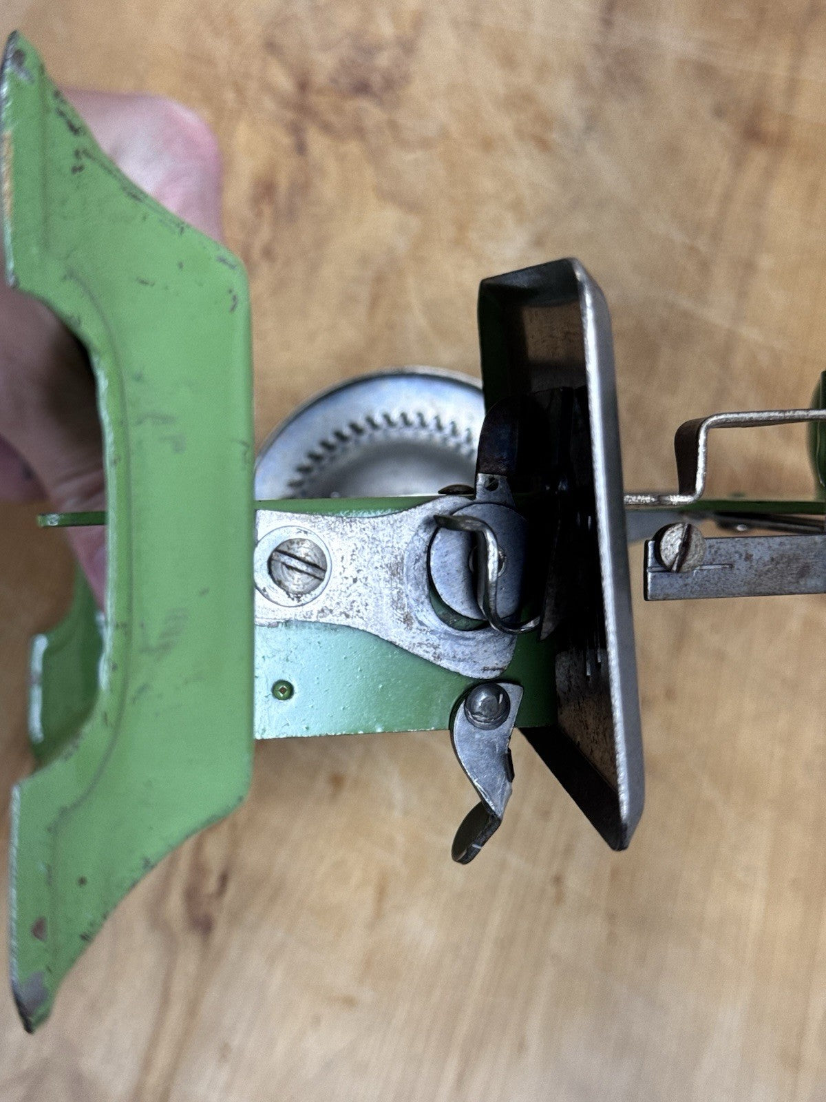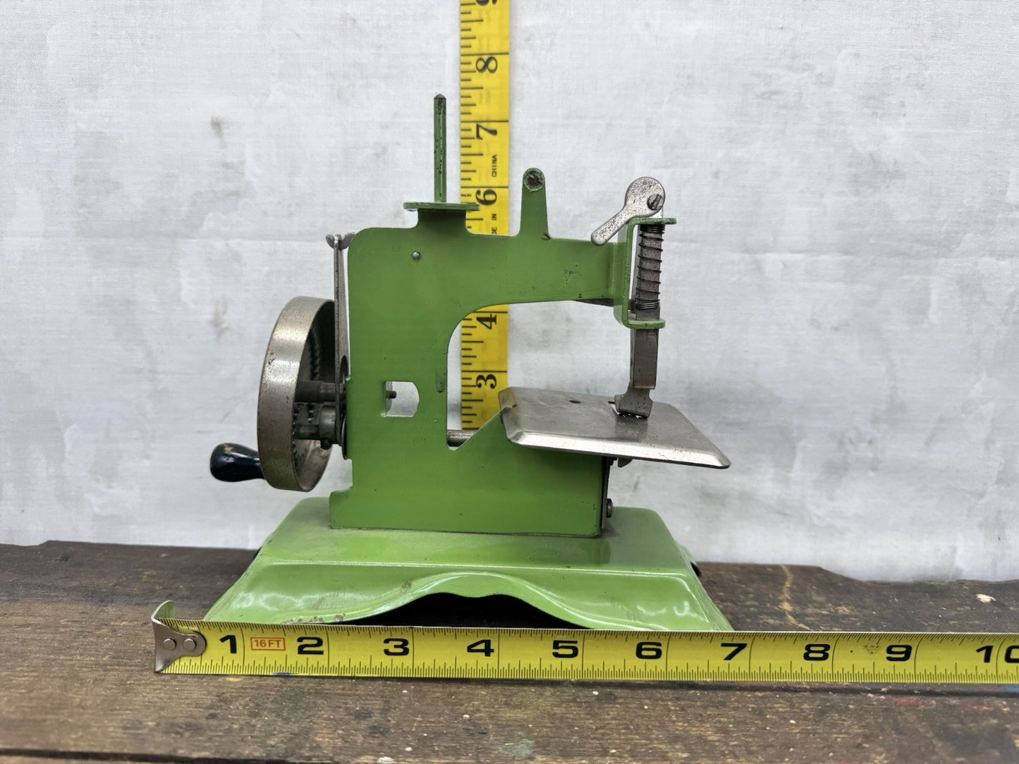 The Antique Child's Sewing Machine in green is a charming collectible piece that hails from a bygone era, specifically pre-1930. This vintage sewing machine, although compact and designed for children, holds sentimental value for those who appreciate the craftsmanship and intricate details of early 20th-century sewing machines. Perfect for collectors or those looking to add a touch of nostalgia to their home, this antique piece is a unique and timeless treasure.