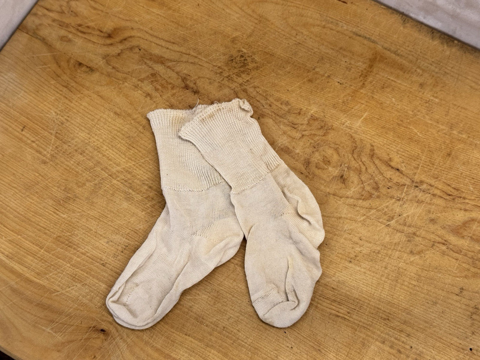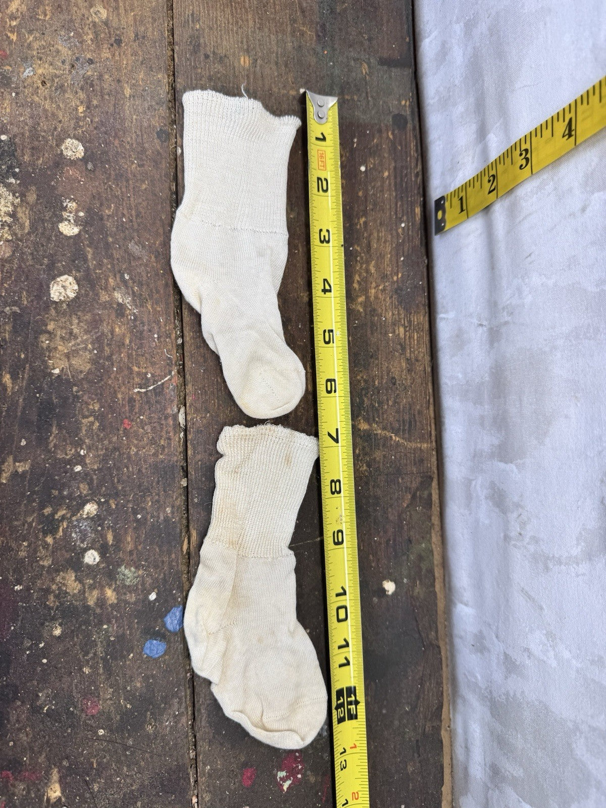 This product is a pair of antique children's socks, specifically sock number . These socks are vintage and likely have a special charm or historical significance, especially for collectors of children's vintage clothing. They may be made of fine materials or feature unique designs that are no longer in production, adding to their appeal for those interested in nostalgic or one-of-a-kind items for their collection.