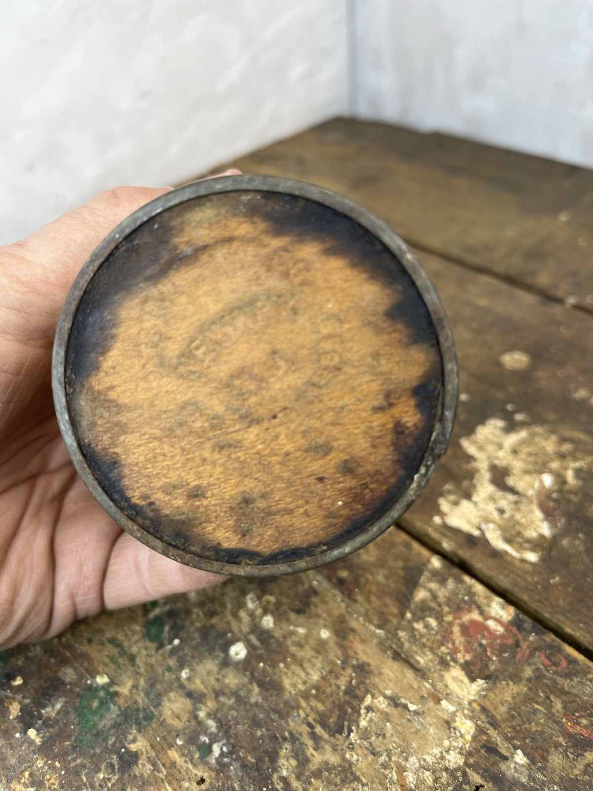 This Antique Collectible Mustard Spice Box is a decorative item for your home, designed with an antique style. It is round in shape and made of wood and metal, giving it a vintage look. The box stands at 3 inches tall and measures 2.5 inches in both length and width, making it a compact piece of decor suitable for displaying in any room. This collectible spice box adds a touch of nostalgia to your kitchen or home decor collection.