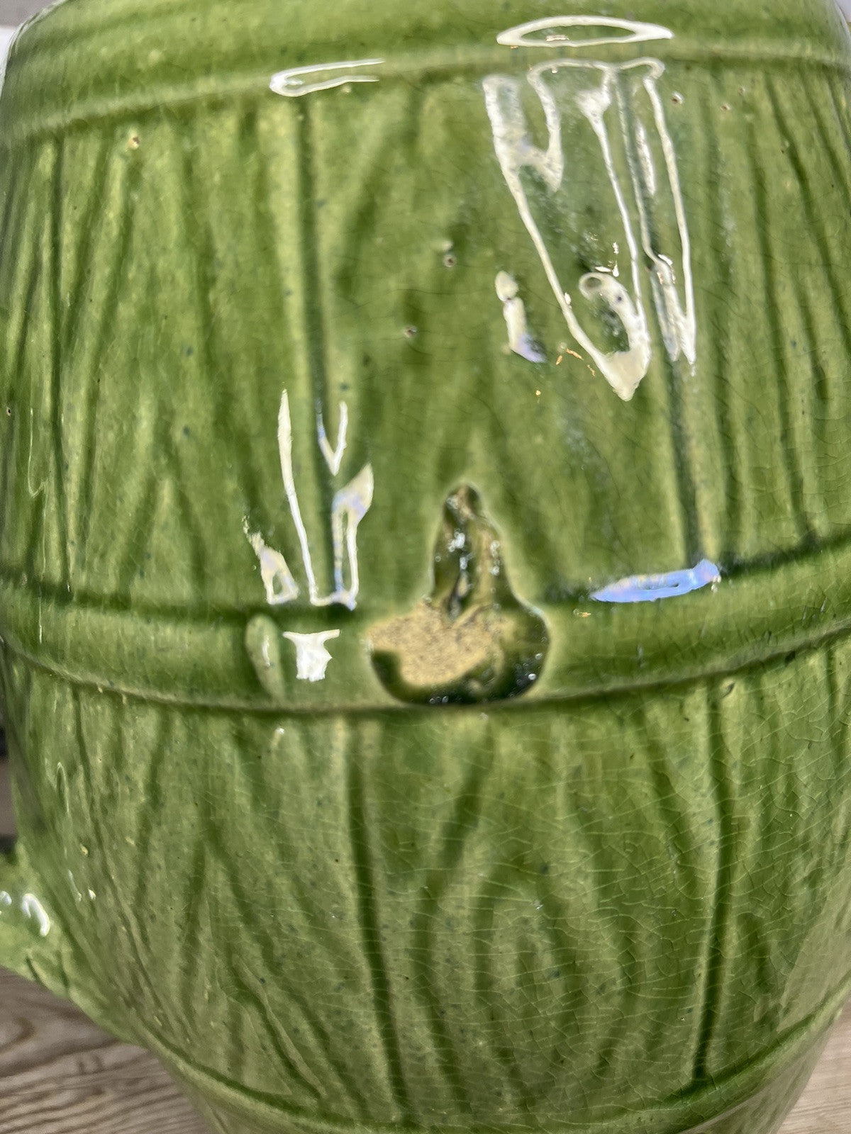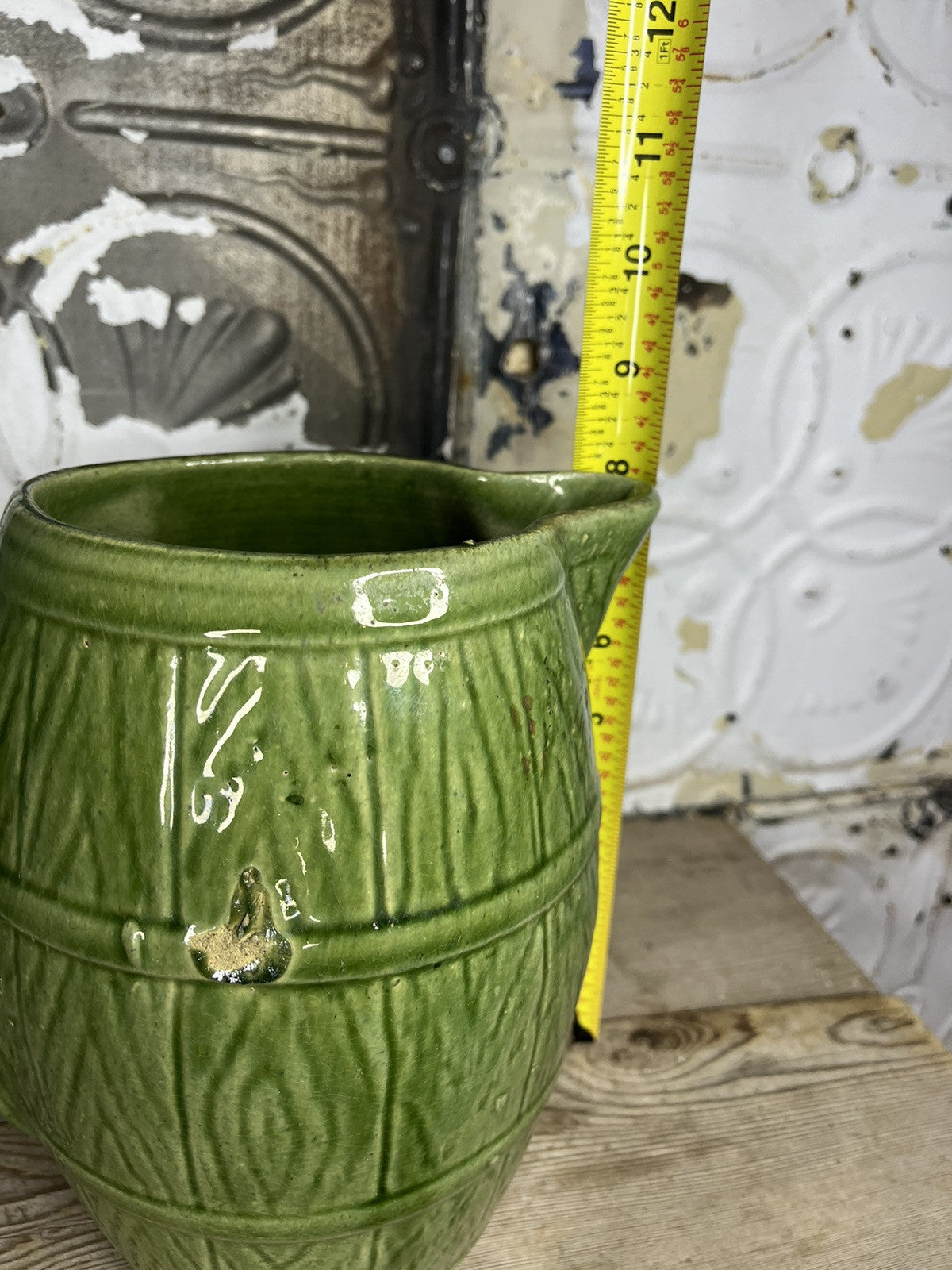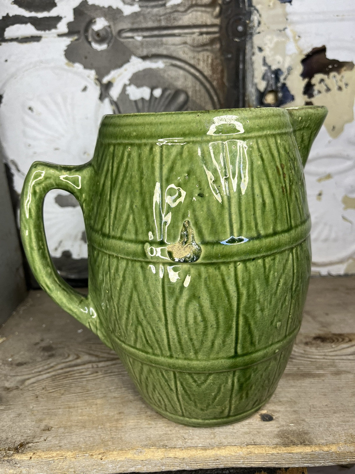 This antique vintage green stoneware pitcher features a barrel pattern and is designed in an antique style. It is a collectible piece with manufacturing flaws that add to its charm and character. Perfect for home decor, this pitcher brings a touch of vintage elegance to any space. Check pics for defects