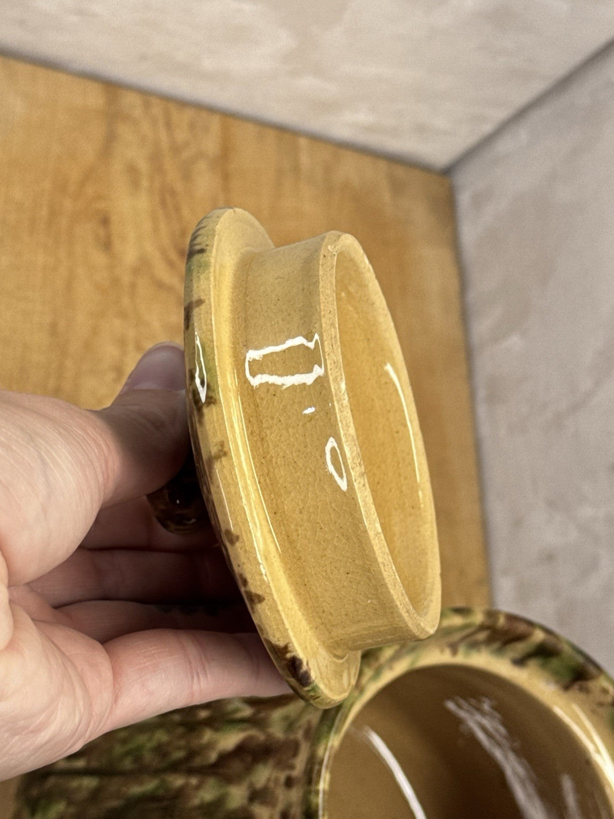 This Antique Yellow Ware Spongeware Tea Pot is a collectible piece of stoneware with a unique yellow color and intricate spongeware design. The model number 1148 adds to its charm and authenticity, making it a desirable addition to any tea set or kitchen decor collection. Perfect for serving tea or as a decorative display, this vintage tea pot offers a touch of nostalgia and whimsy to any home.