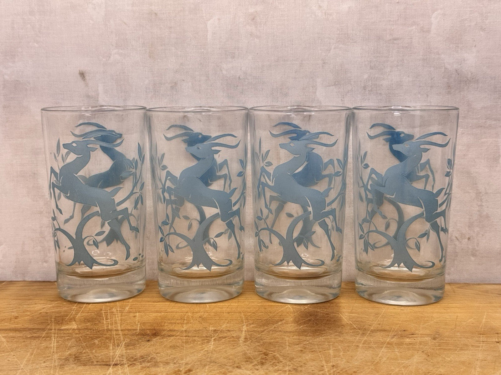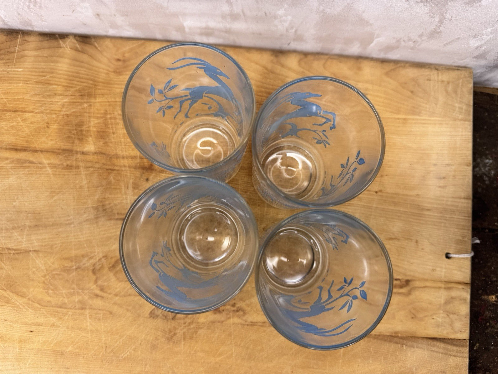 Blue Reindeer Set Of Four Clear Glass Vintage #1210