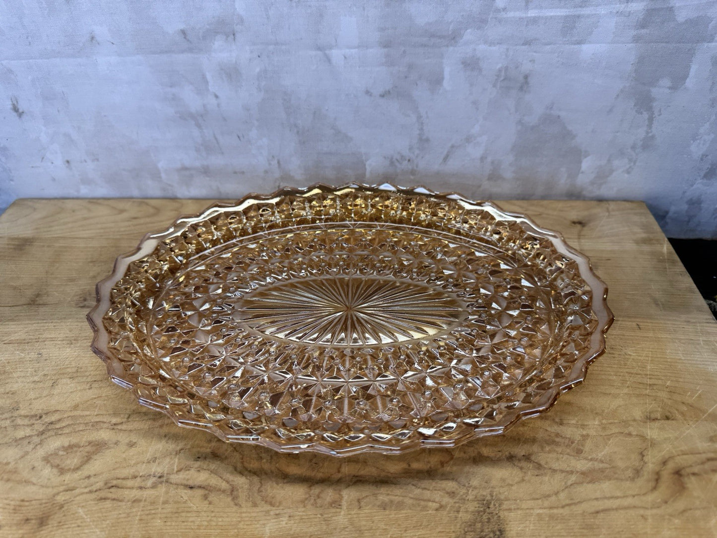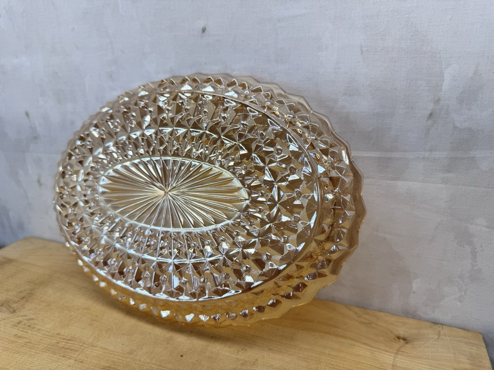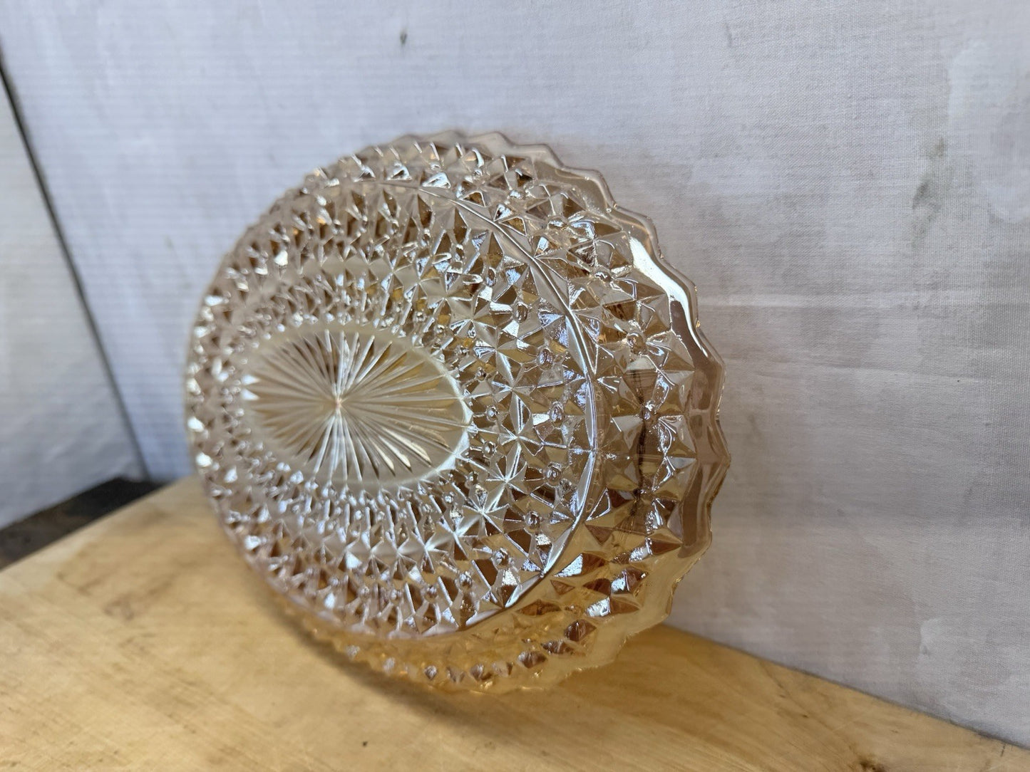 The Carnival Glass Jeanette is a decorative bowl made of glass in the production style of Carnival Glass. This collectible piece features intricate designs and vibrant colors that are characteristic of the Carnival Glass art form. With its unique and eye-catching appearance, this bowl would make a charming addition to any home decor setting.