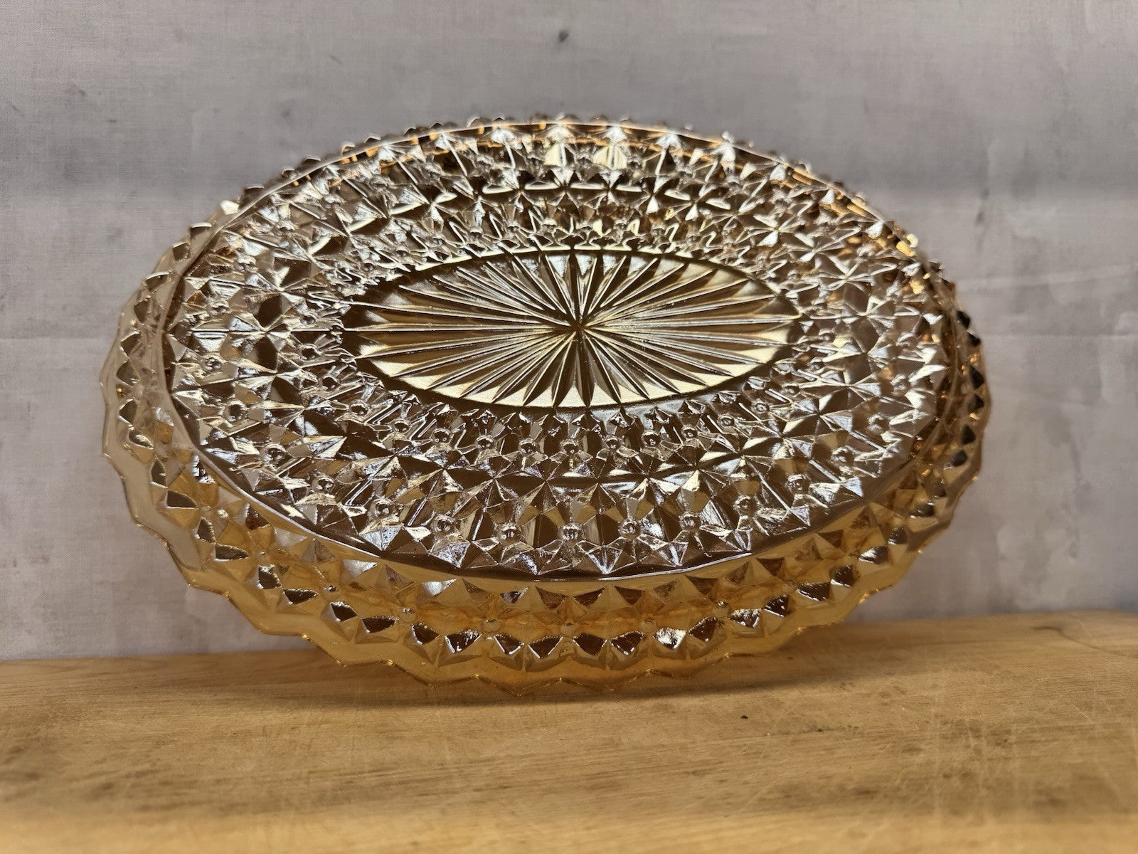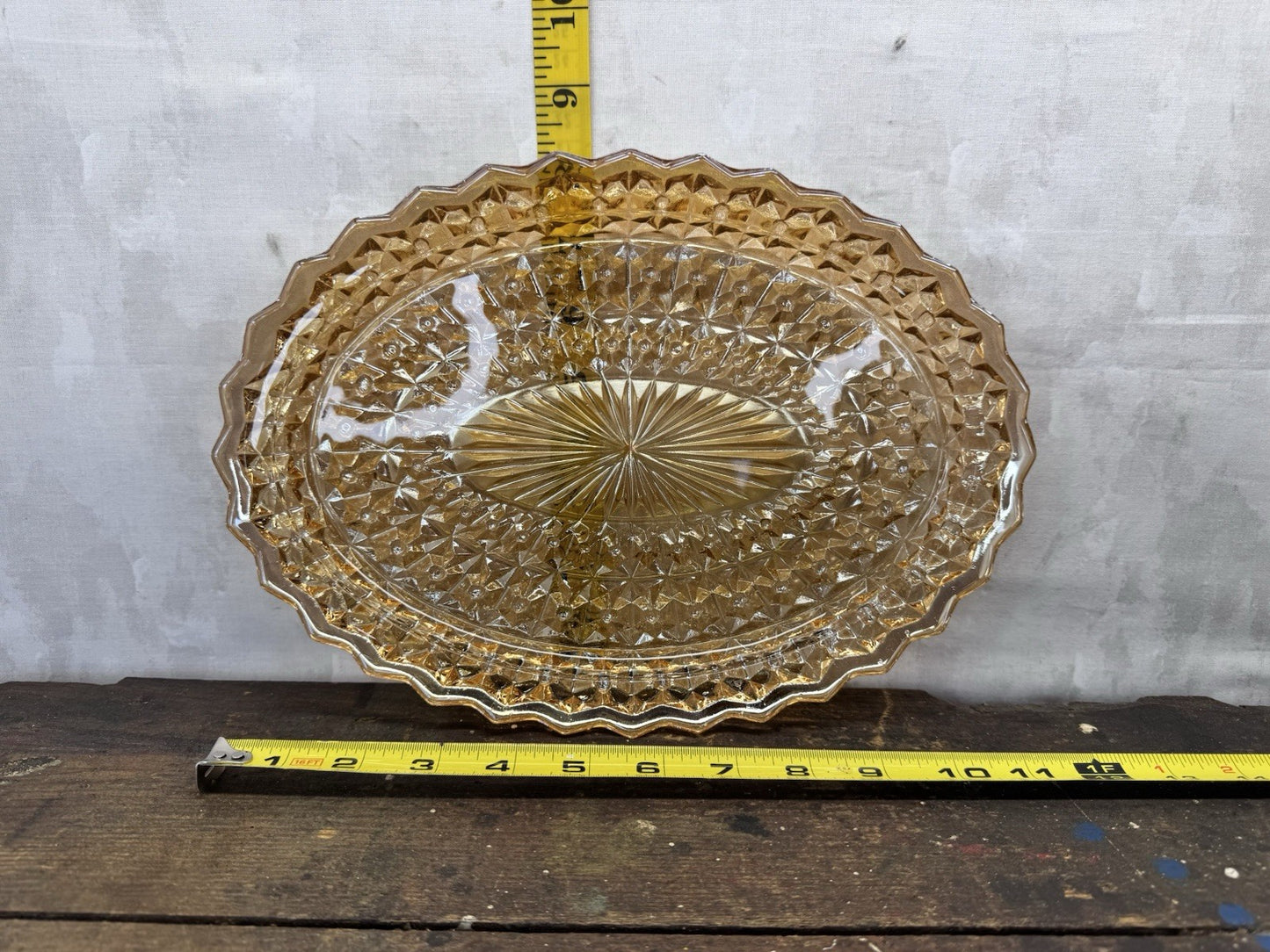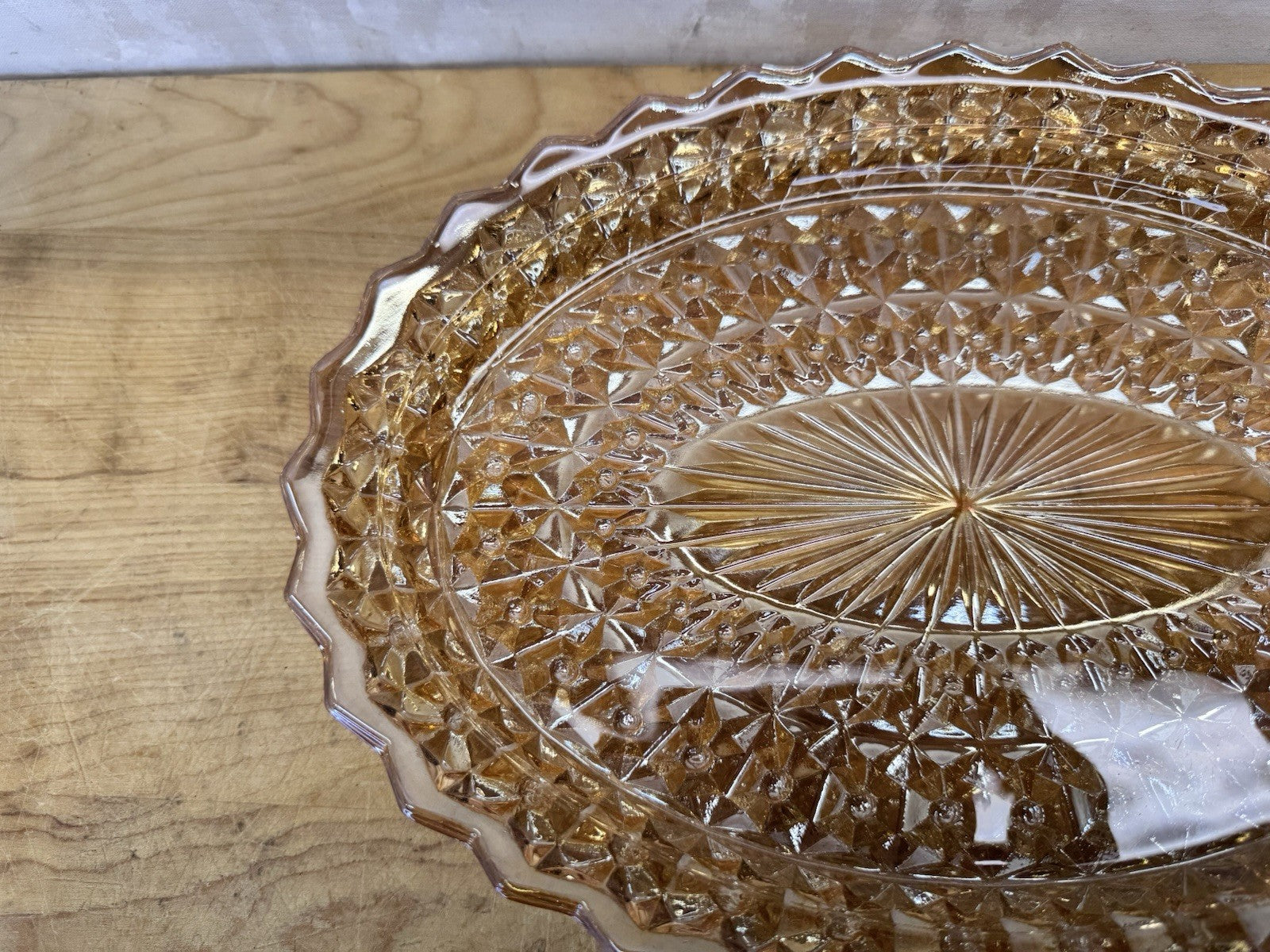 The Carnival Glass Jeanette is a decorative bowl made of glass in the production style of Carnival Glass. This collectible piece features intricate designs and vibrant colors that are characteristic of the Carnival Glass art form. With its unique and eye-catching appearance, this bowl would make a charming addition to any home decor setting.