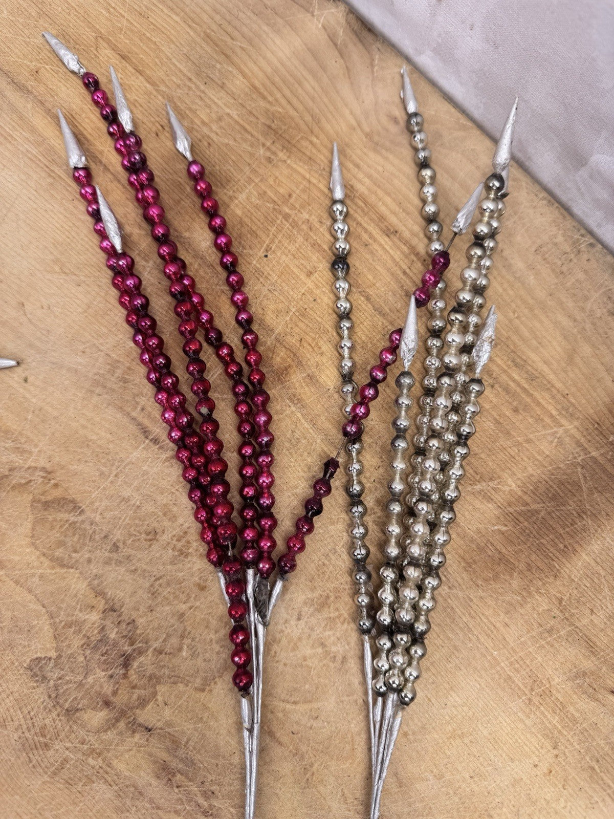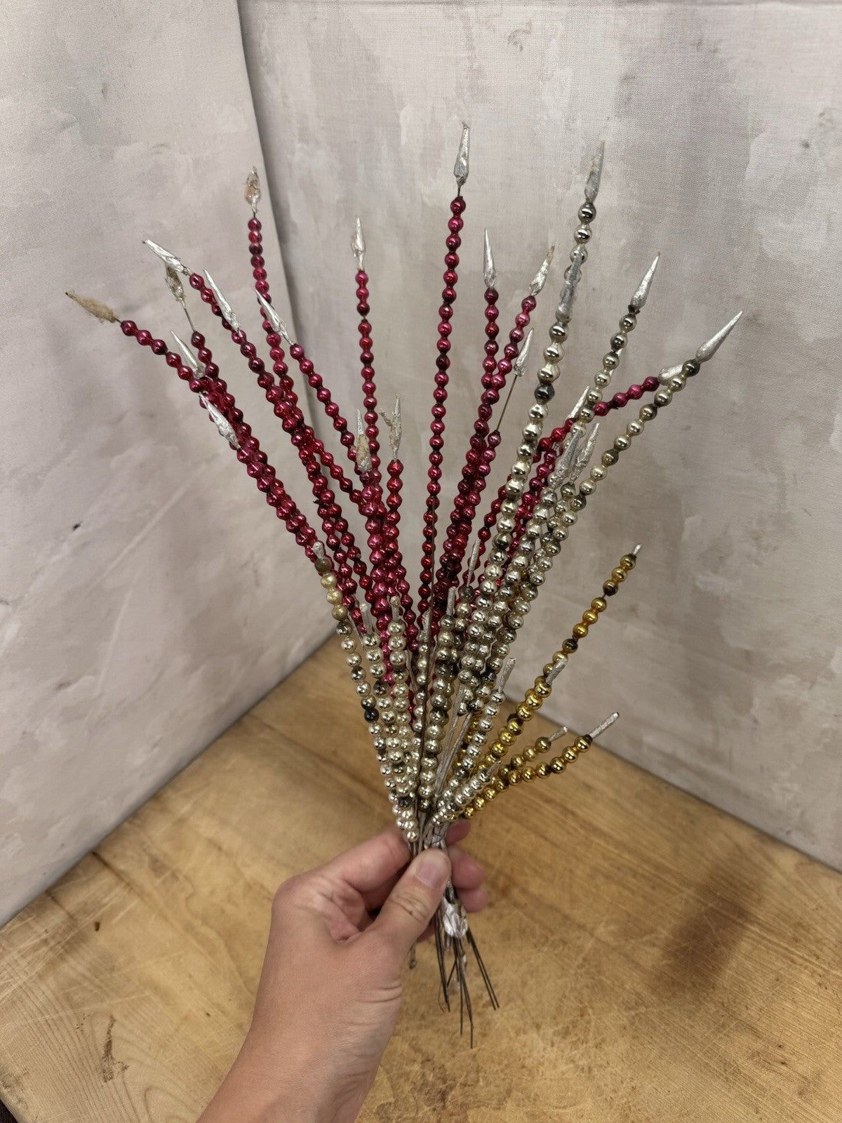 This vintage Christmas glass bead stick garland is a charming addition to any holiday decor. The garland features delicate glass beads in various festive colors, perfect for adding a touch of holiday cheer to your home. The floral design adds a touch of elegance to the already beautiful garland, making it a lovely choice for Christmas celebrations. 6 total mercury glass