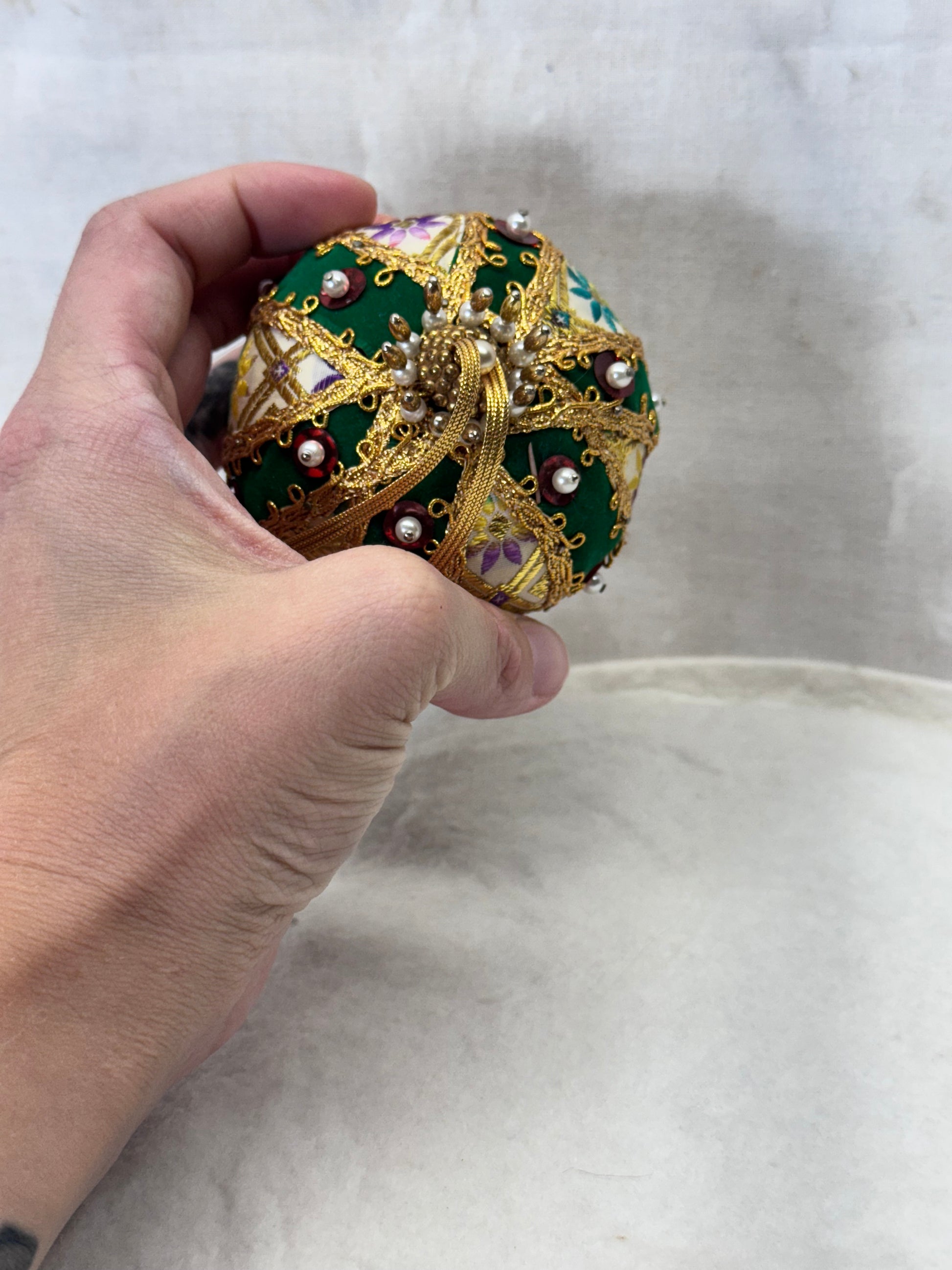 This vintage Christmas ornament features a secure push pin for effortless display. Its tear drop shape and fabric material add a touch of nostalgia to your holiday decor. Make decorating a breeze with this elegant and functional ornament.