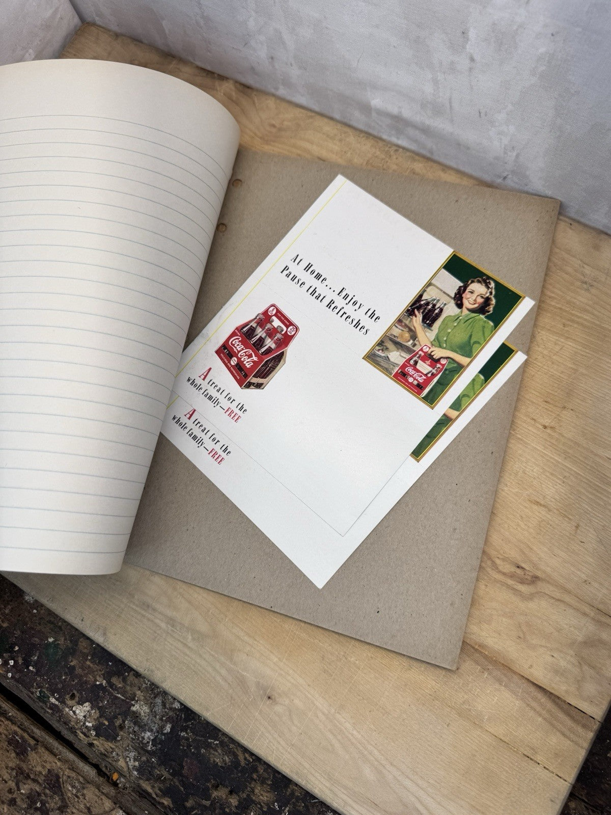 The product is a vintage Coca Cola advertising notebook featuring unique and retro designs promoting the iconic soda brand. Perfect for collectors or fans of Coca-Cola memorabilia, this notebook captures the nostalgia of advertising campaigns from the past. The vintage theme and brand promotion make it a special and charming piece for anyone interested in classic soda advertising.