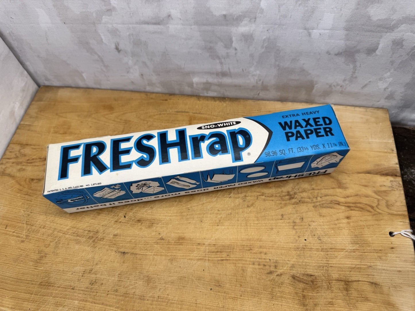 The FRESHrap Waxed Paper Vtg Box is an antique kitchen tool that showcases a vintage waxed paper box with a unique design and brand. This collectible item is perfect for adding a touch of nostalgia to any kitchen or home décor. Its retro charm and functionality make it a sought-after piece for those who appreciate antique kitchen tools and gadgets.