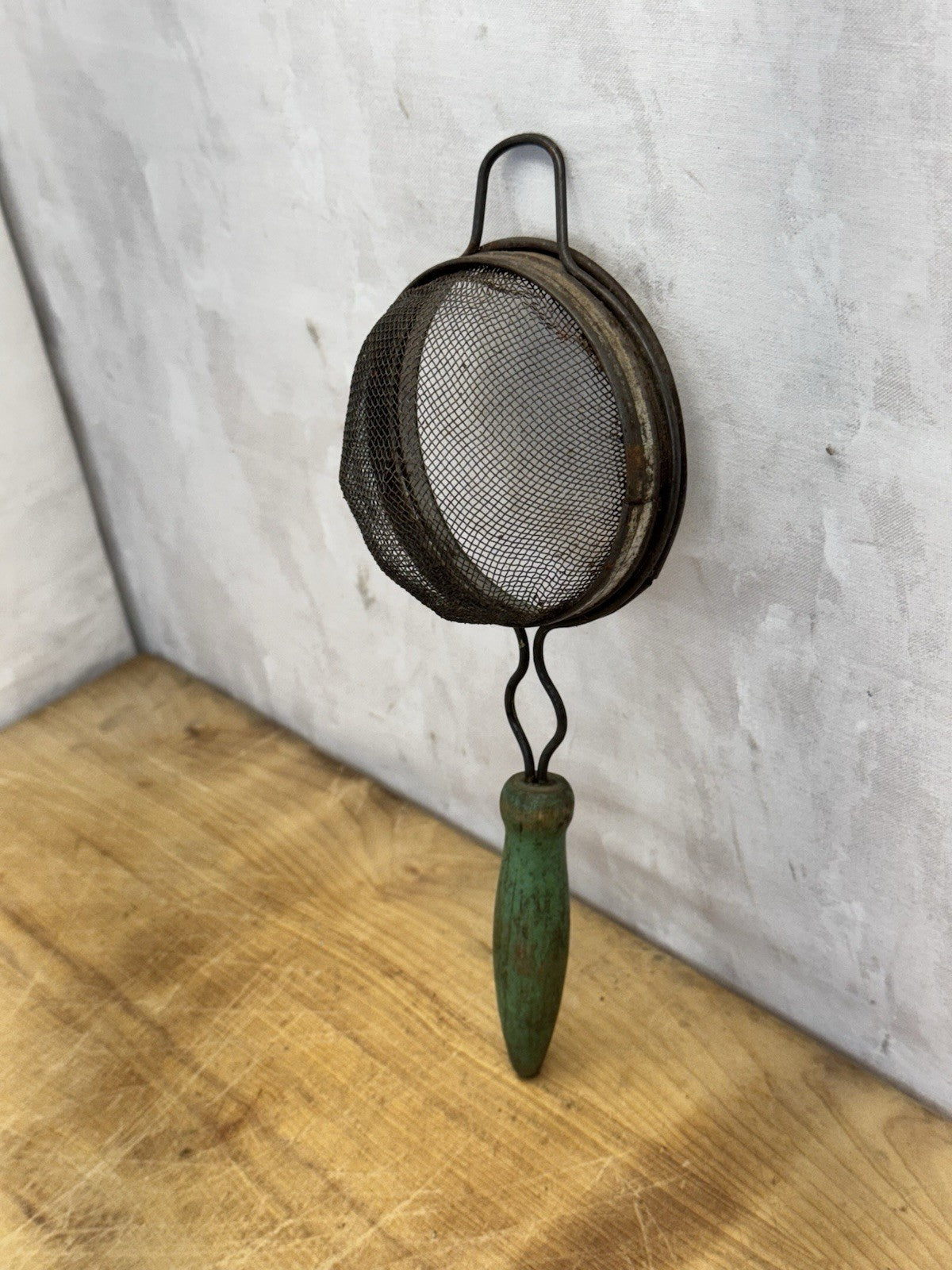 The product is a vintage mini green strainer with a handle, made by the brand Antique. It is designed for kitchen use and is a unique addition to any collection of kitchen tools and gadgets. Its small size and vibrant green color make it a standout piece in the kitchen, perfect for straining small quantities of ingredients while cooking. The handle provides a convenient way to hold and use the strainer, making it a practical and decorative item for any home chef.