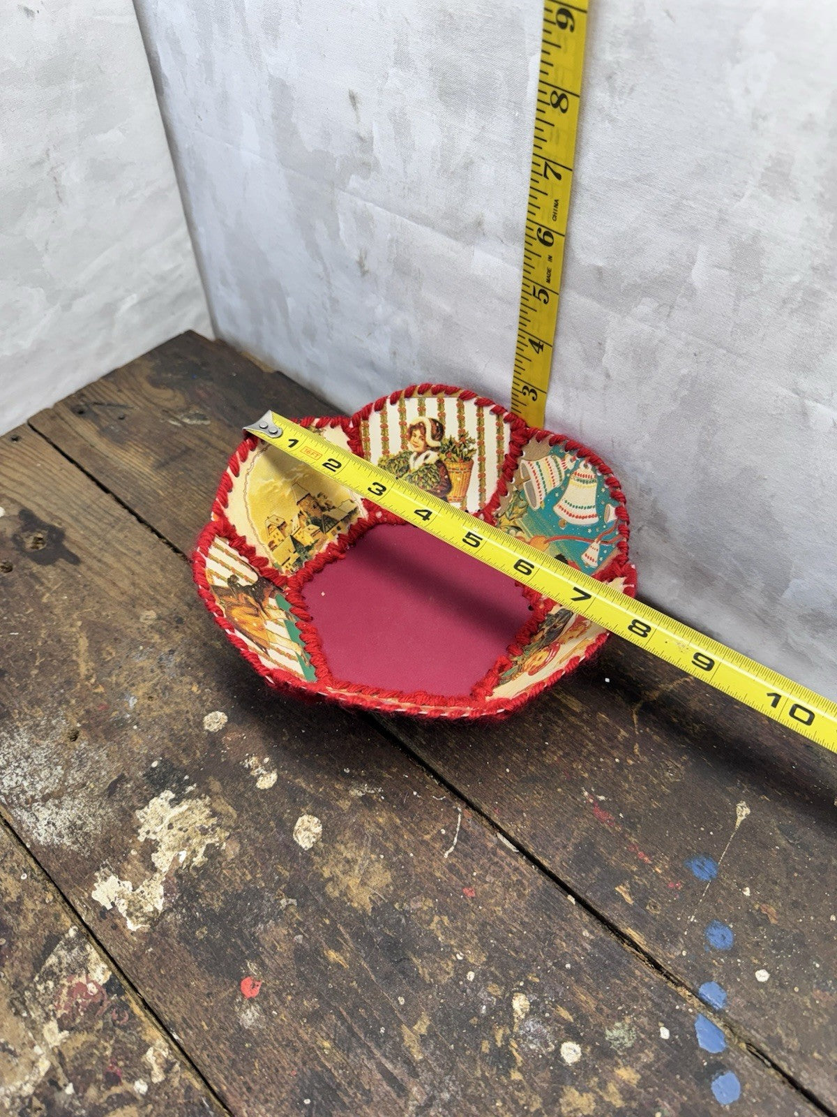 This product is a handmade bowl made from Christmas cards, perfect for the holiday season. The brand specializes in creating unique and festive pieces for collectors or those looking to add a special touch to their kitchen or home decor. The vintage design and Christmas theme make it a charming addition to any holiday celebration.