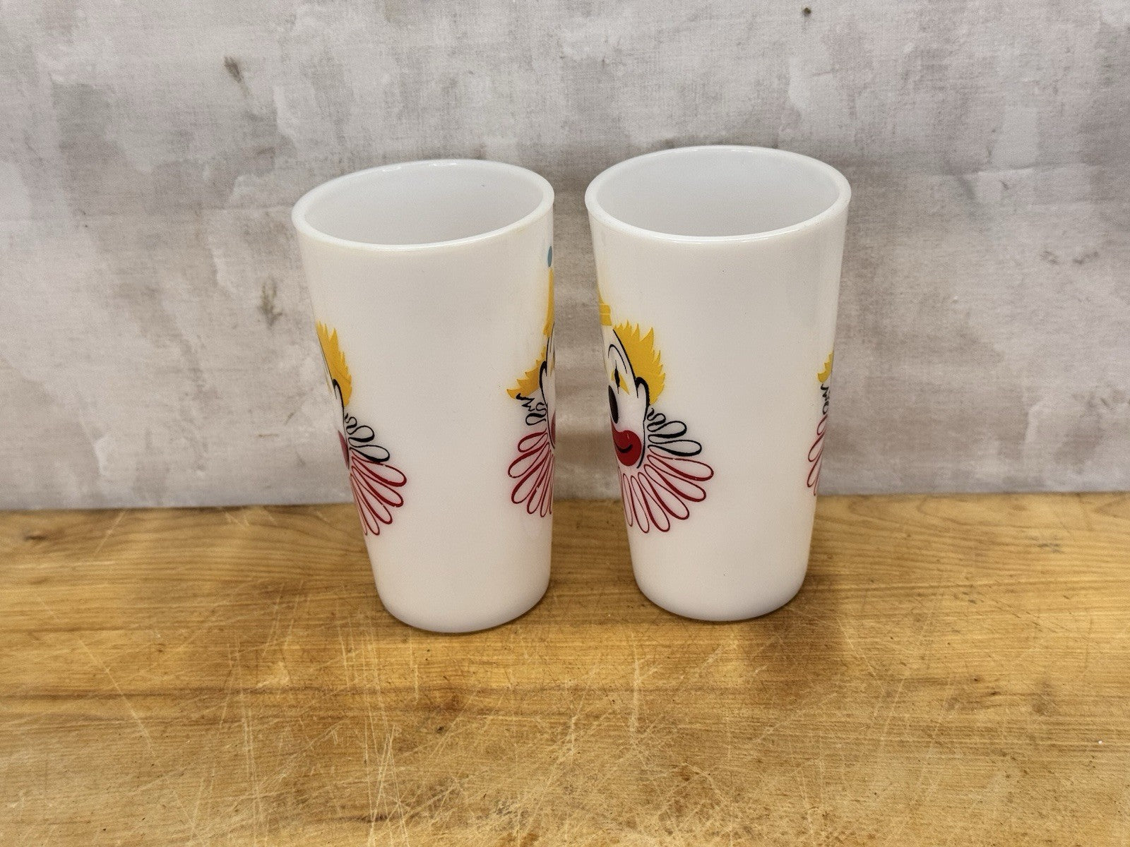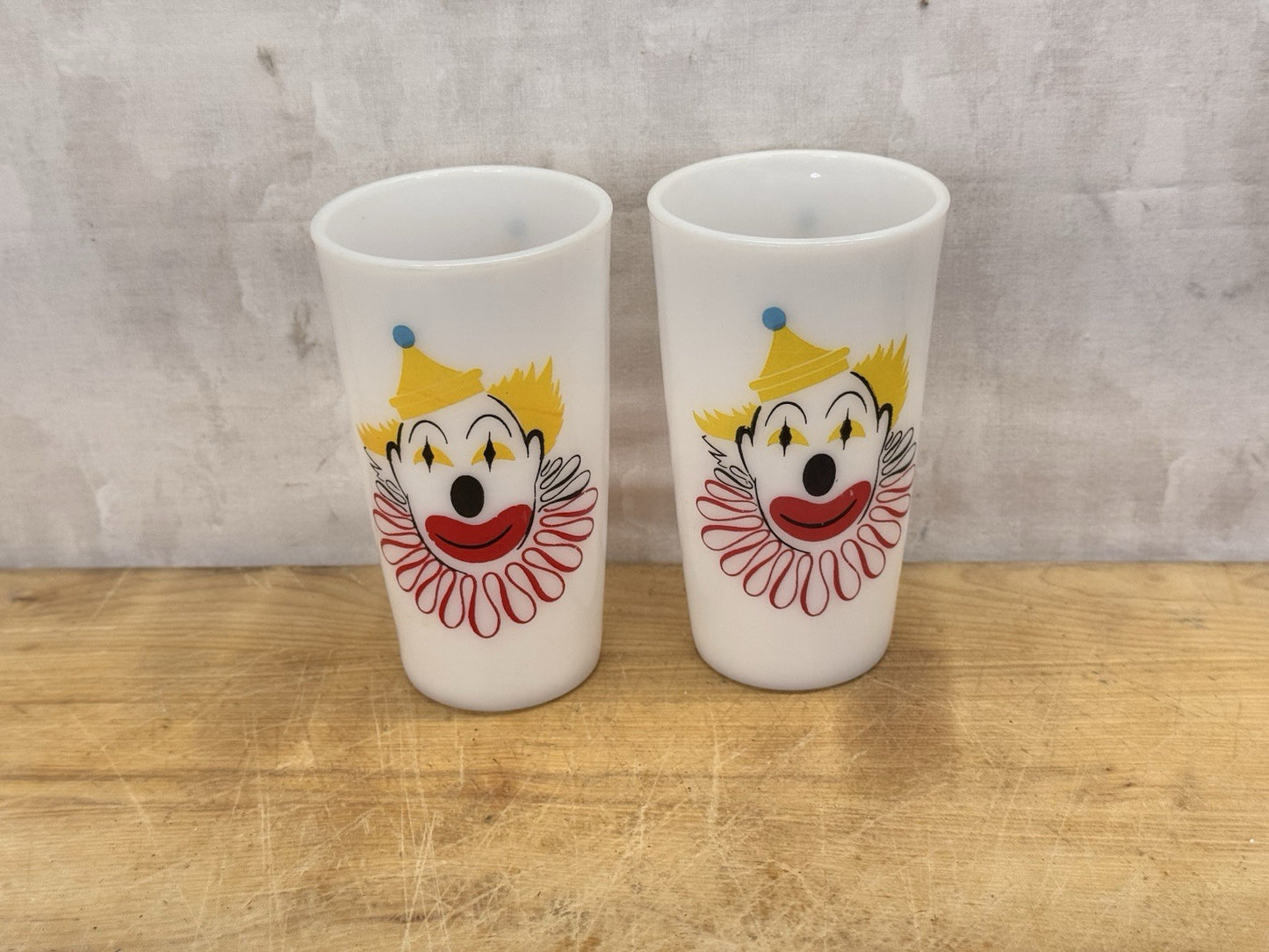 Hazel Atlas Carnival Clown Cups 2 Milk Glasses Vtg