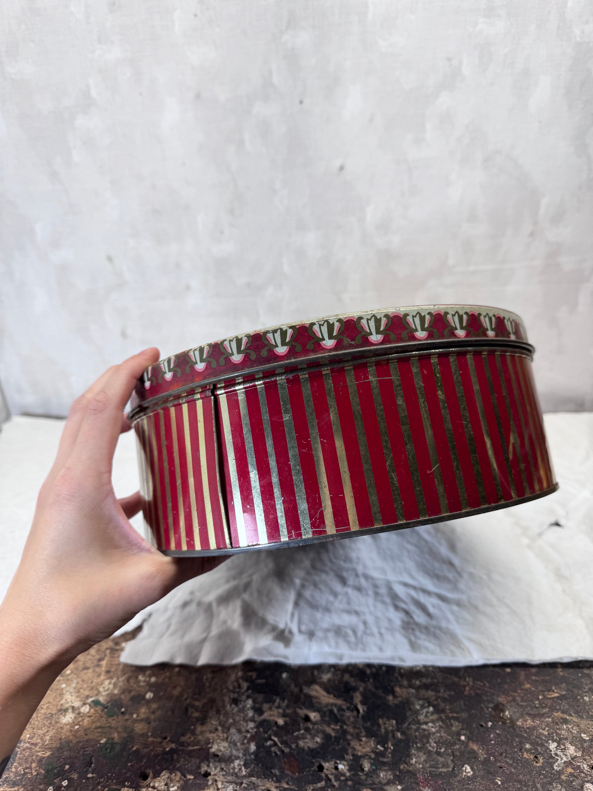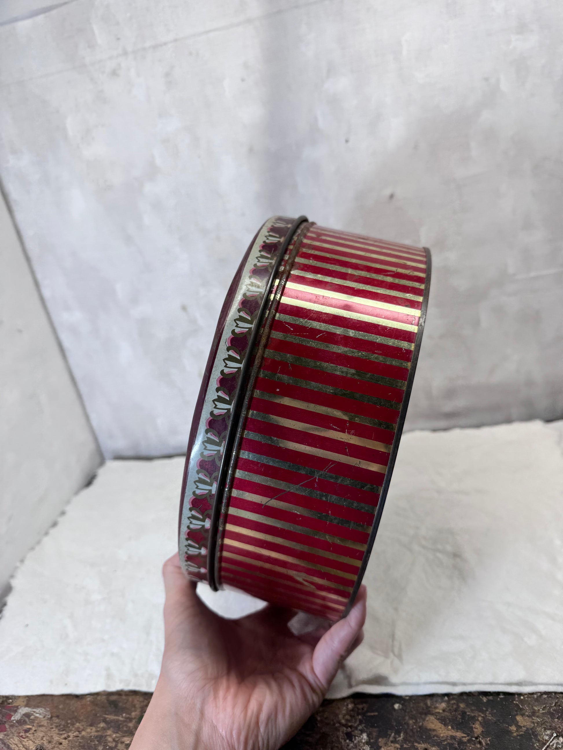 This vintage Christmas tin is a charming addition to any holiday decor. Its round shape and empty interior make it perfect for holding small gifts, candies, or trinkets. With a stylish hummingbird design, this tin is sure to delight both young and old during the festive season.