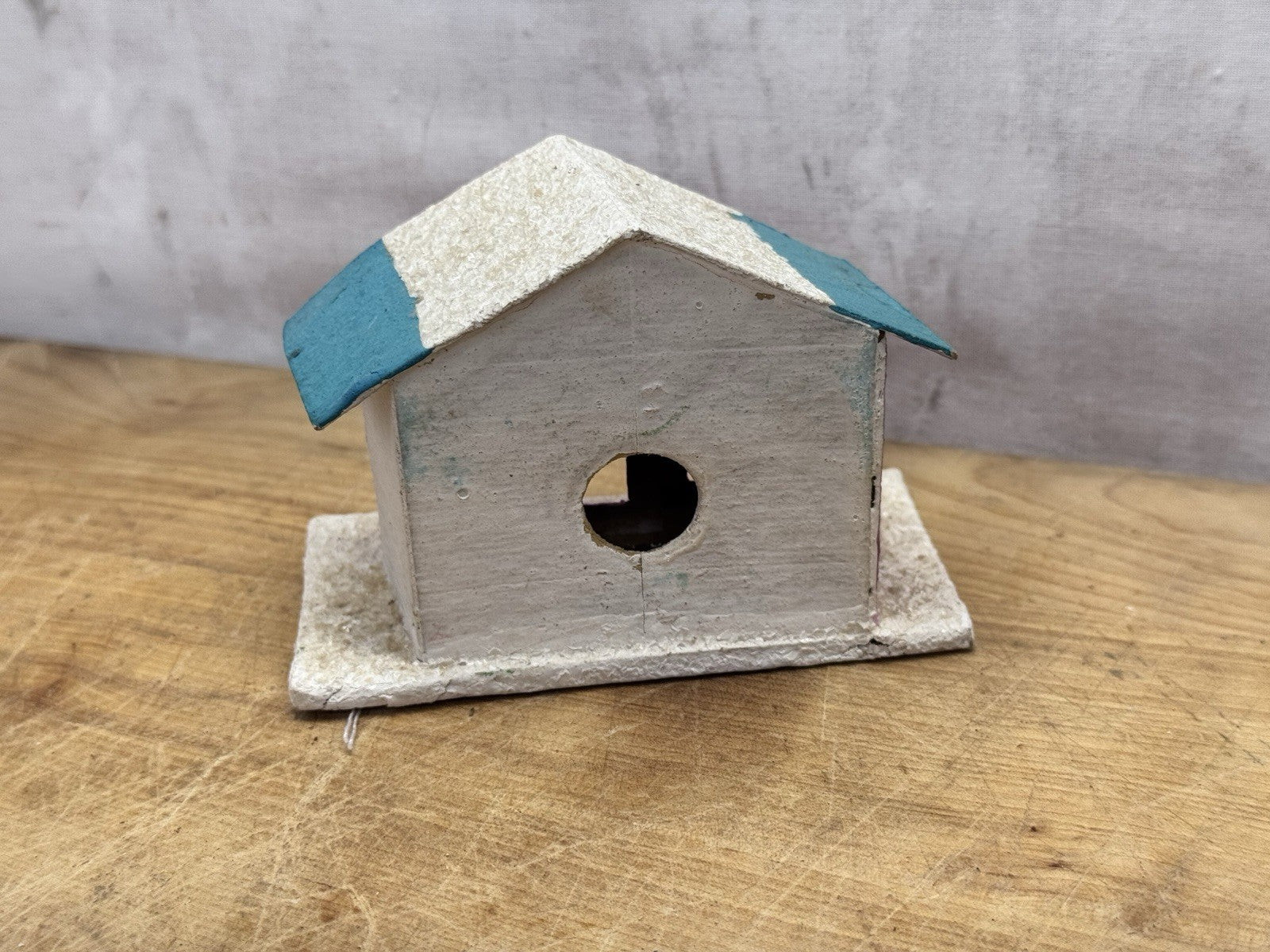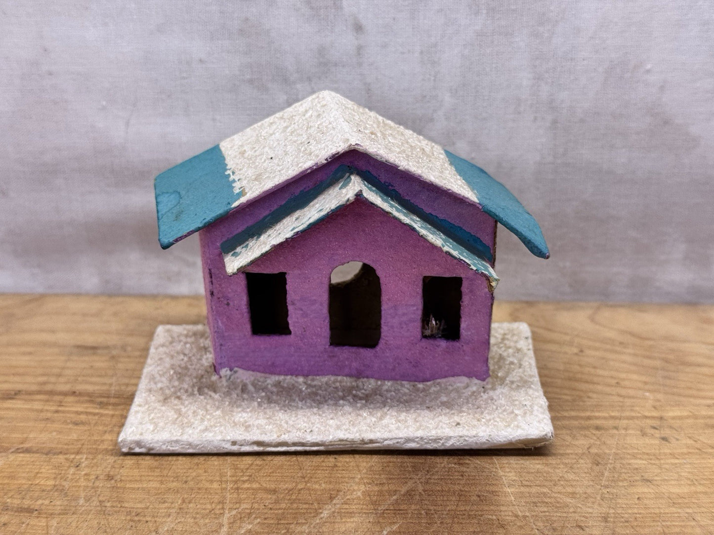 The product is a small pink Putz House, specifically designed for Christmas. It features an antique finish, adding a unique charm to any holiday decor. This collectible village house is perfect for adding a whimsical touch to seasonal displays or for displaying on a mantel or shelf during the festive season. Its small size makes it easy to incorporate into various holiday settings, adding a festive ambiance for Christmas celebrations.