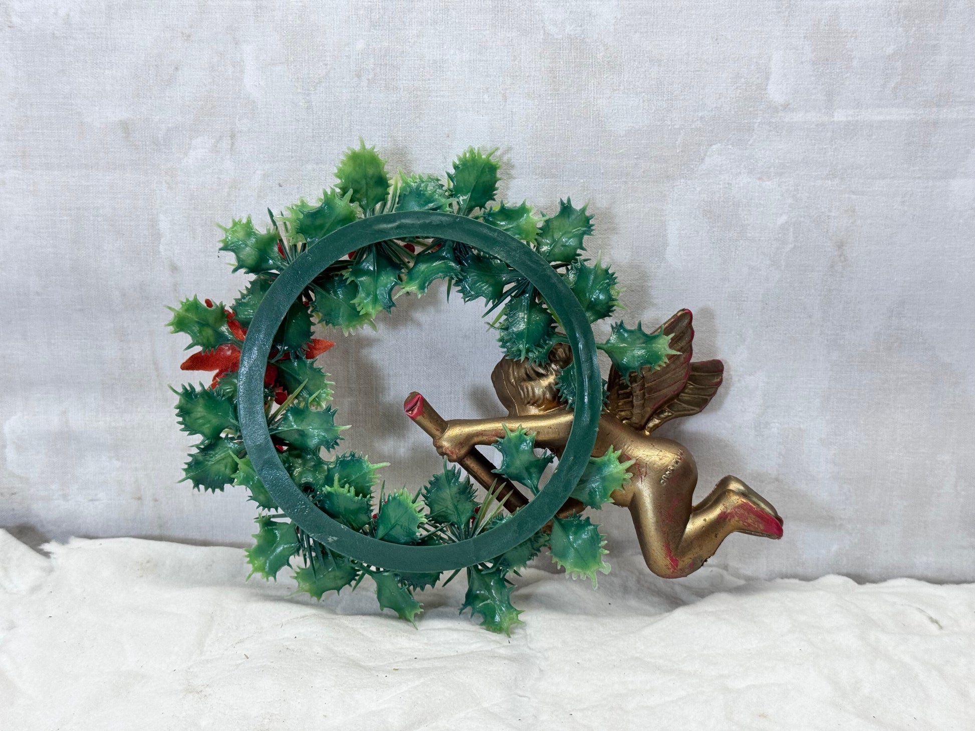 This vintage plastic wreath is the perfect addition to your Christmas decor. Crafted to add a touch of festive charm, it features a beautiful angel design that will bring joy and warmth to your home. Celebrate the season in style with this unique and timeless piece.
