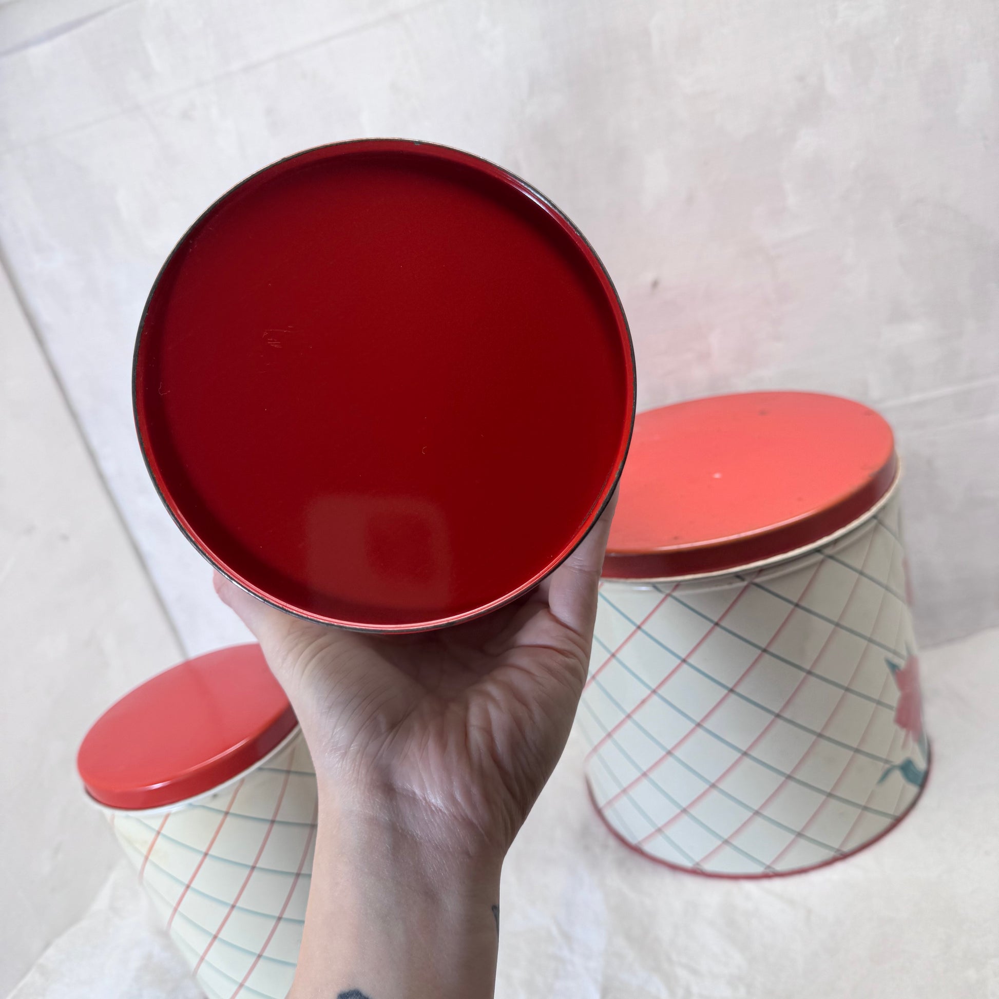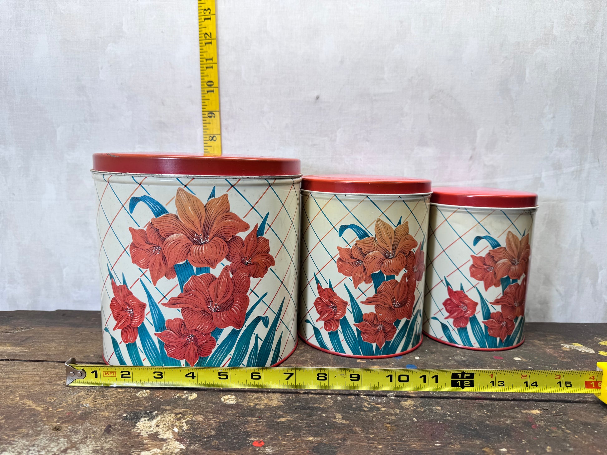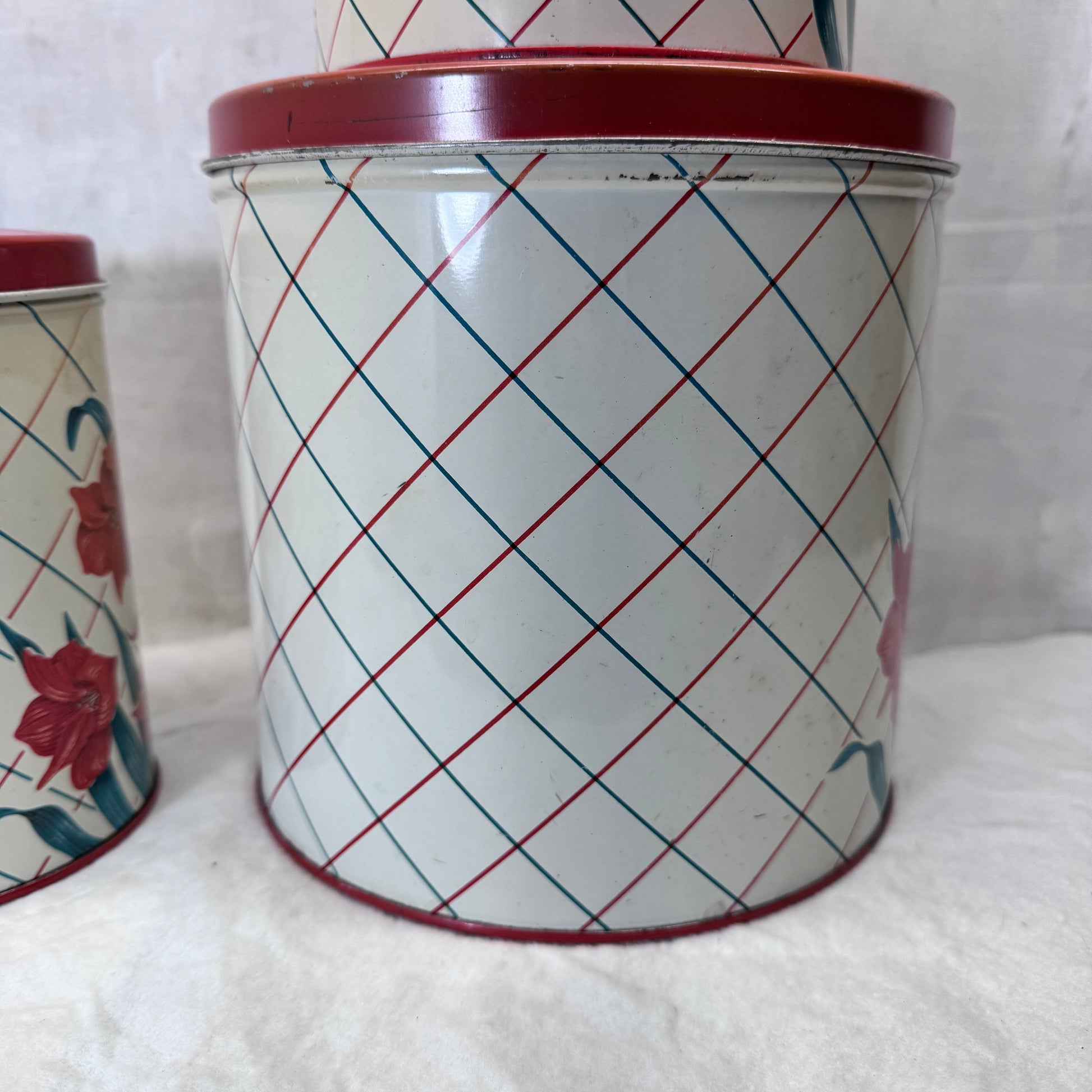 Red Green Floral Kitchen Canister Christmas Tin Set Vintage #2195
