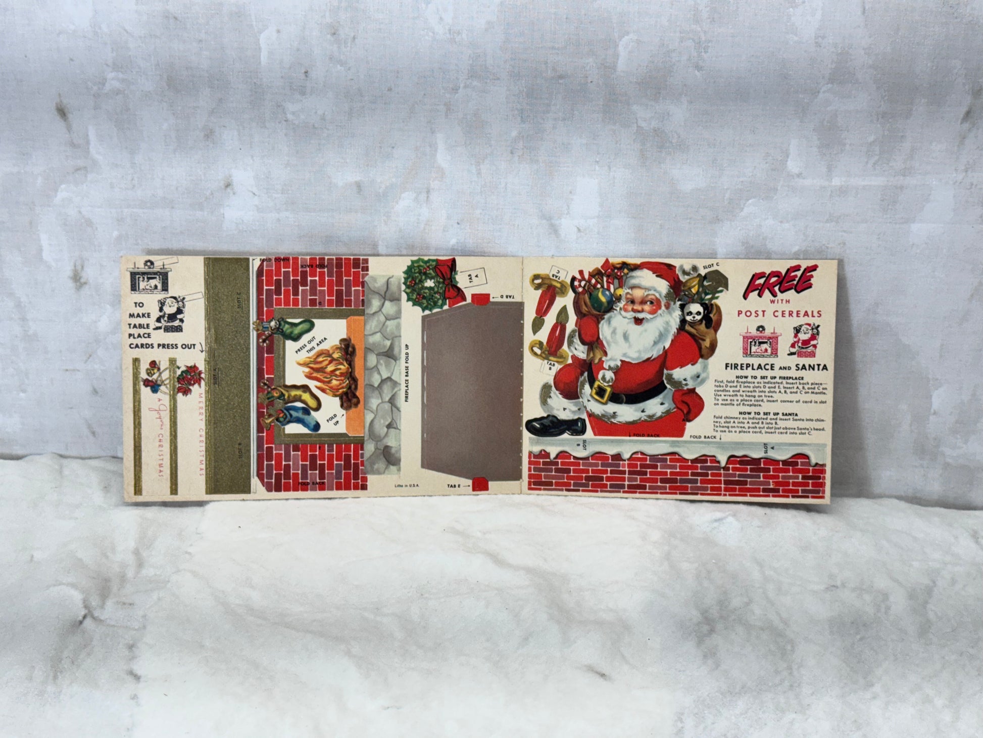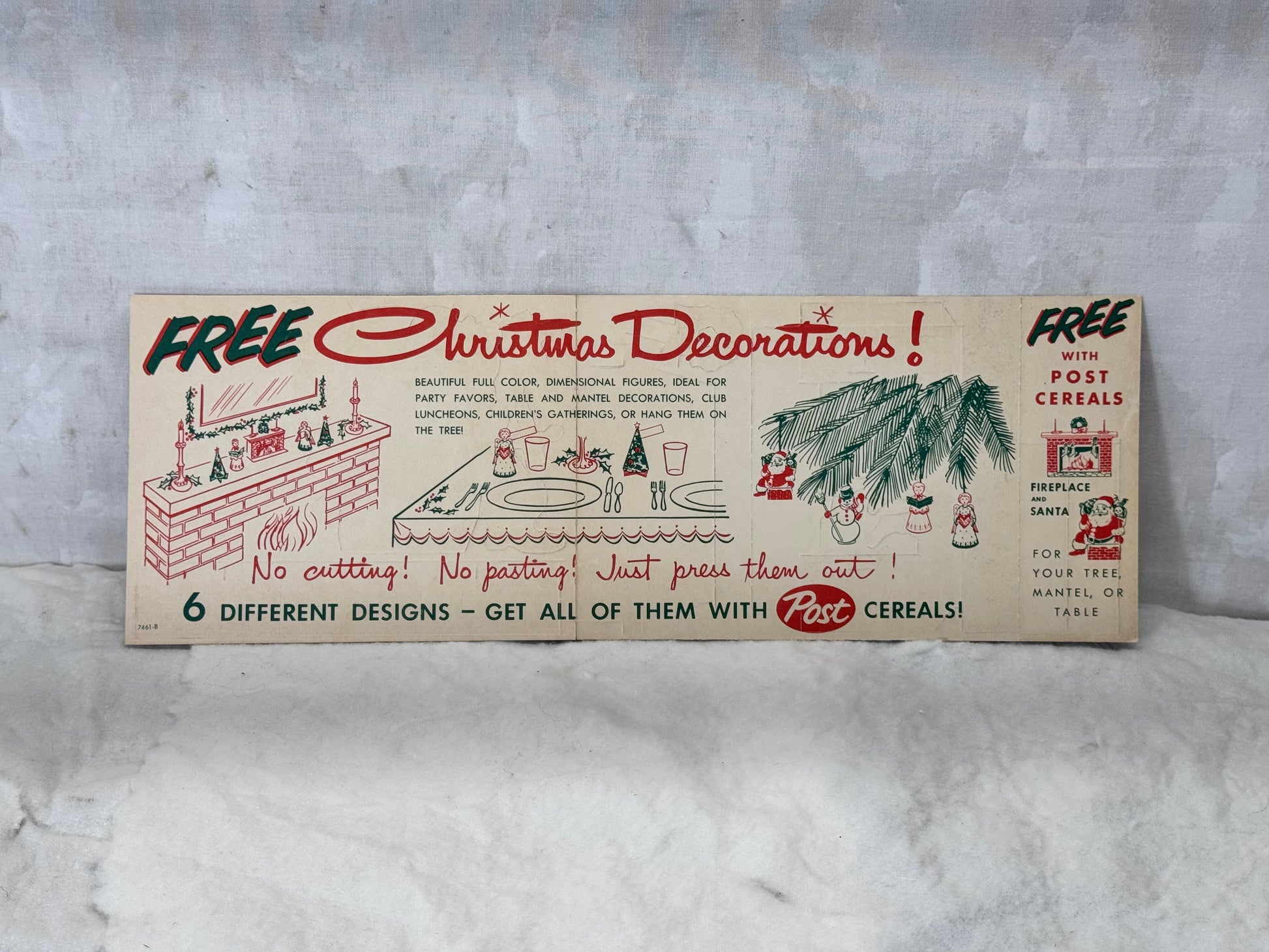 This Santa Claus mini heavy paper cut-out by Post Cereal is a vintage collector's item. Perfect for the holiday season, it adds a touch of nostalgia to any home. Made with high-quality materials, this cut-out is sure to impress with its intricate design and durable construction. Bring the joy of Christmas with this unique and rare piece.