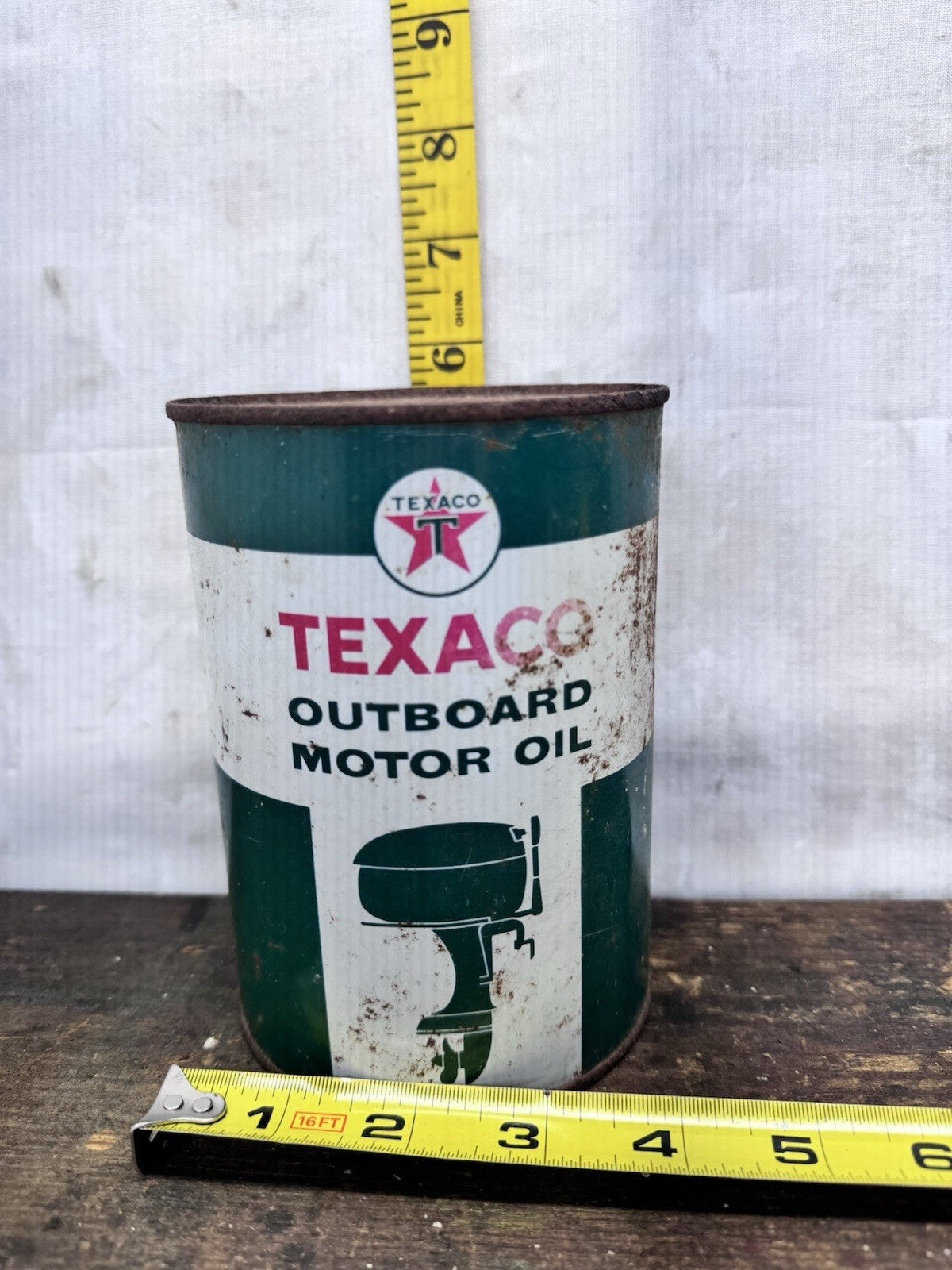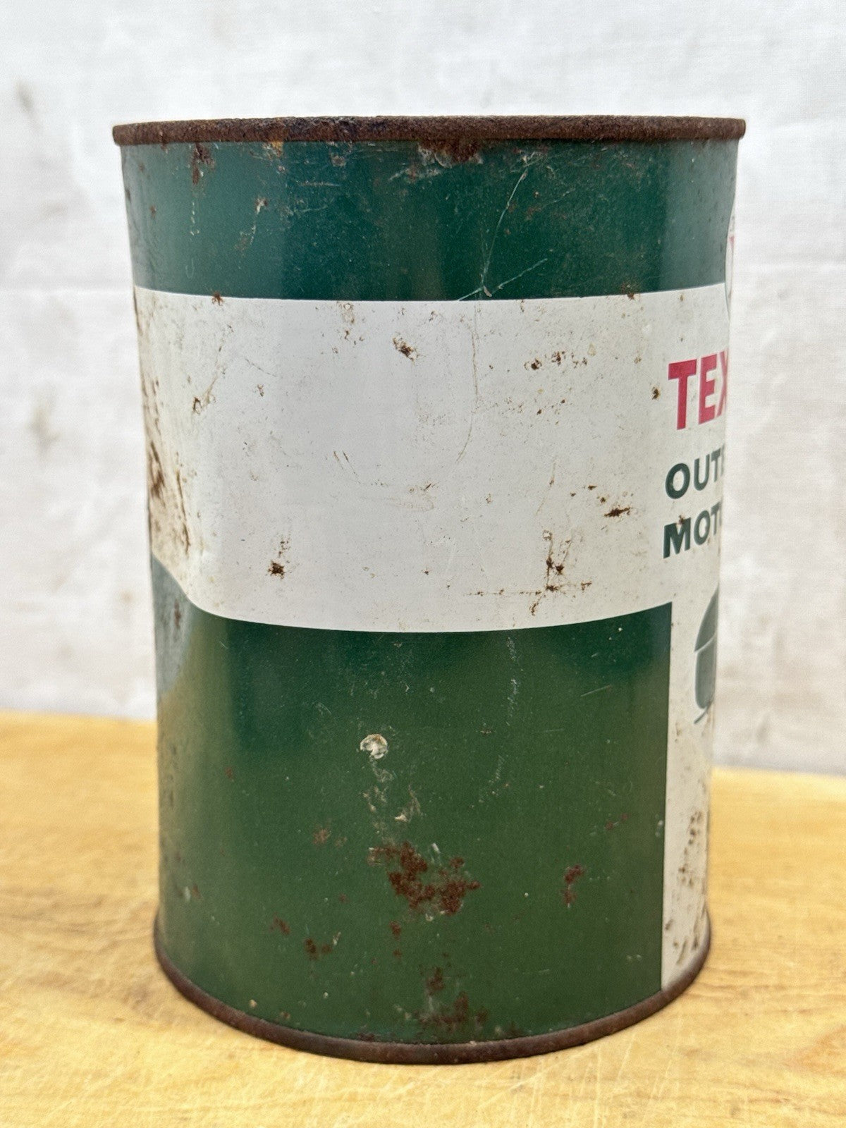 The Texaco Outboard Motor Tin is a vintage collectible with a colorful design inspired by the gas and oil theme associated with the Texaco brand. This original piece showcases the brand's iconic imagery and would make a unique addition to any collection of advertising memorabilia. Its retro design and originality add to its appeal as a sought-after item for collectors interested in vintage gas and oil memorabilia. I cleaned
