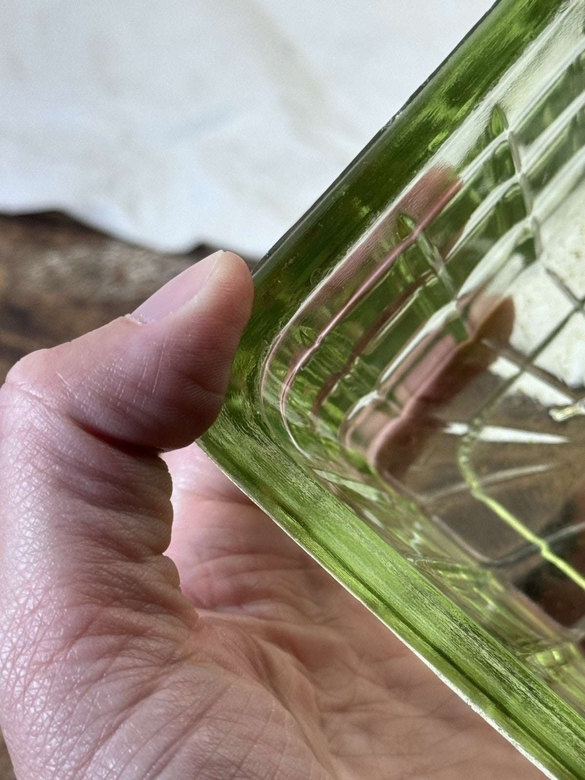 The Uranium Butter Dish Lid is a unique and collectible piece made from uranium glass. The green color adds a touch of elegance to any kitchen or dining table. This unmarked brand ensures a sense of authenticity and craftsmanship in the design of this decorative cookware item. Perfect for storing and serving butter in style, this butter dish lid is a practical and stylish addition to any home kitchen.