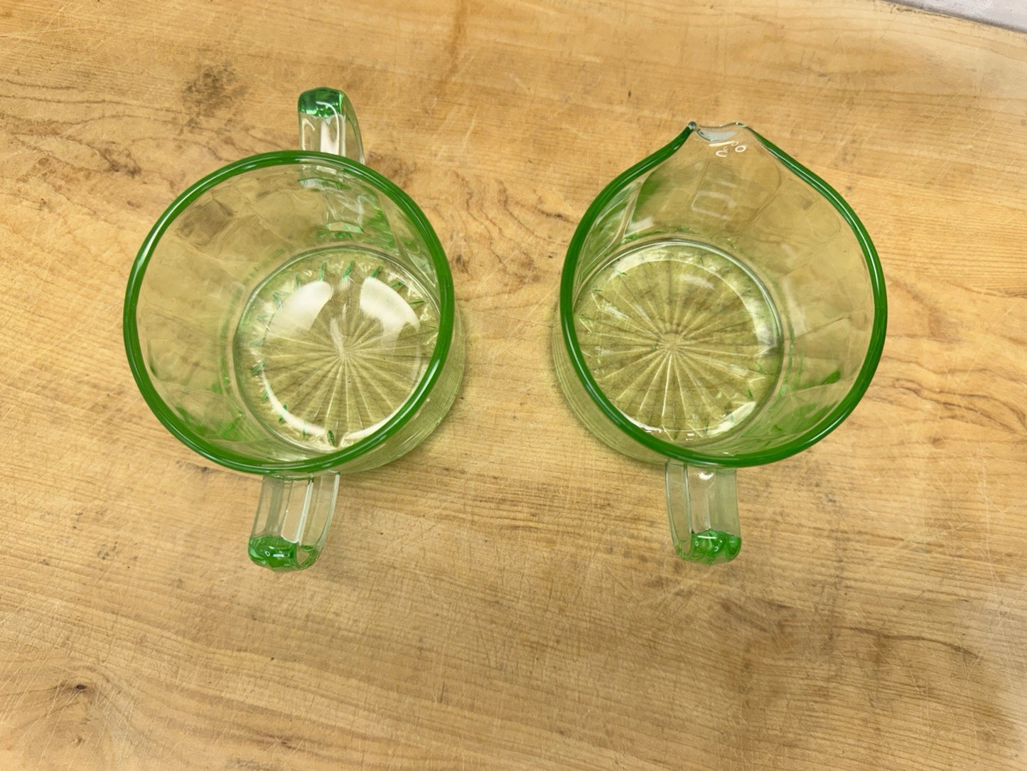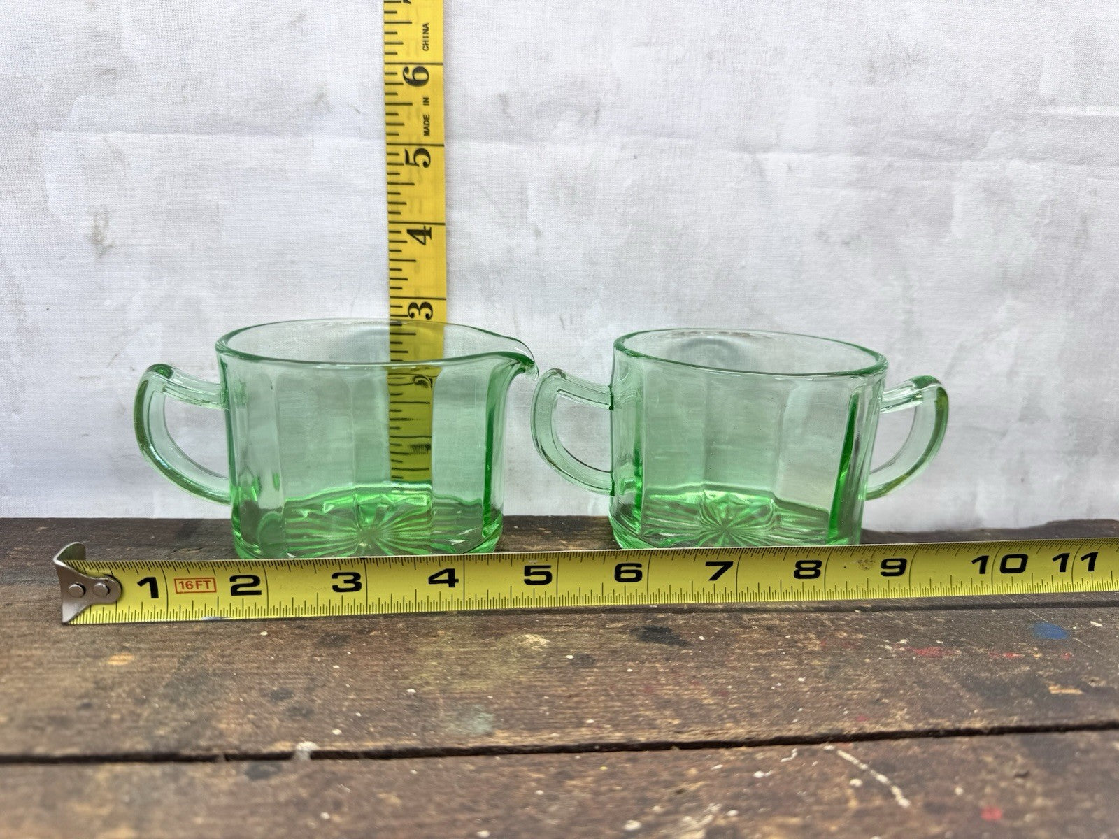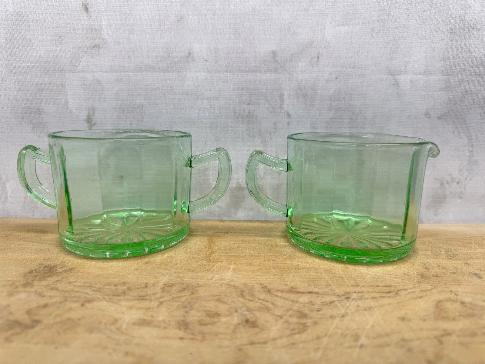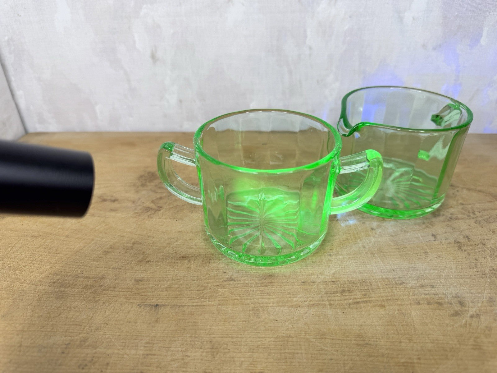 The Uranium Cream and Sugar Set is a collectible dinnerware set made of glass in a unique uranium color. This set includes a creamer and a sugar bowl, perfect for serving cream and sugar at the table. With its stylish and eye-catching design, this set is sure to add a touch of elegance to any dining experience. Perfect for collectors of vintage kitchen items or those looking to add a pop of color to their dining decor.