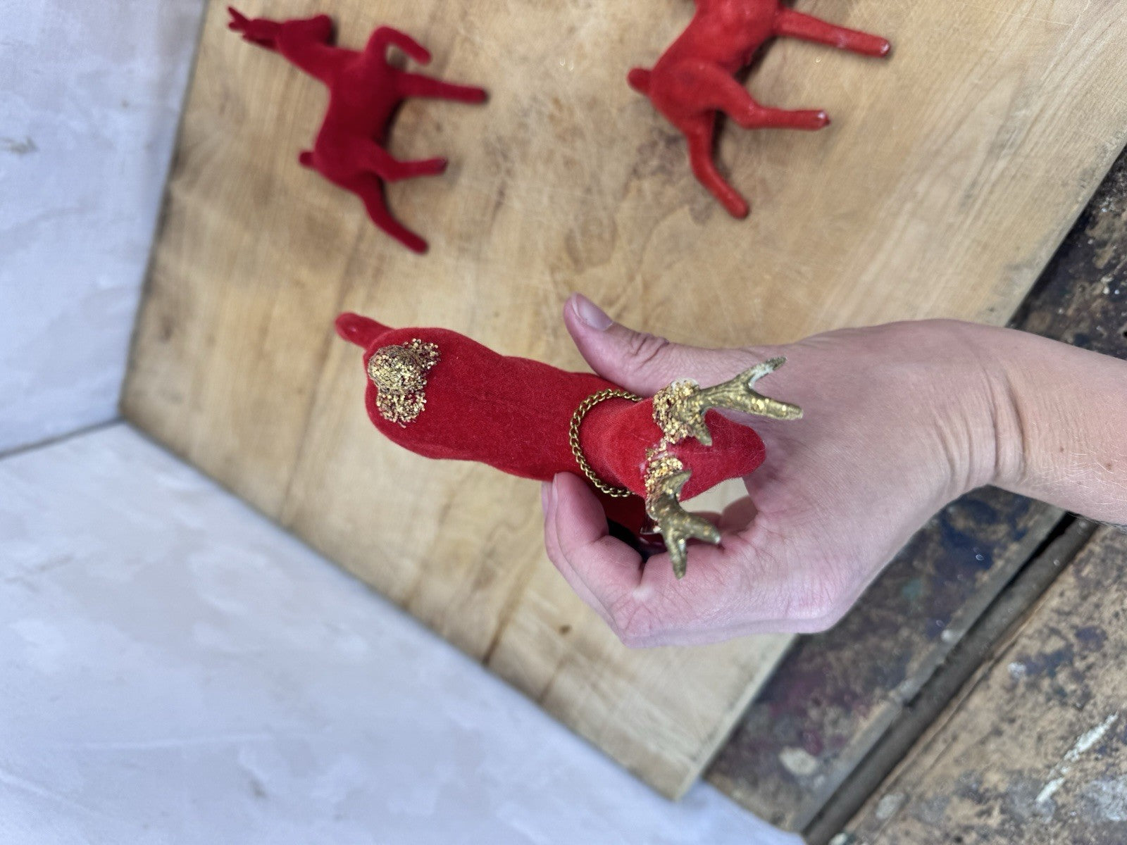 Vintage 6 Plastic Reindeer Red Flocked #1552