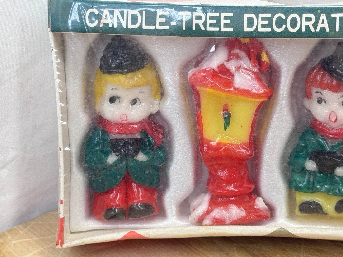 The product is a set of vintage, never-used candles in their original box. The candles are made of wax with an antique finish, adding a nostalgic touch to any holiday decor. Whether displayed on a tabletop or as part of a fireplace mantel, these boxed candles are sure to enhance the festive atmosphere of any Christmas celebration.