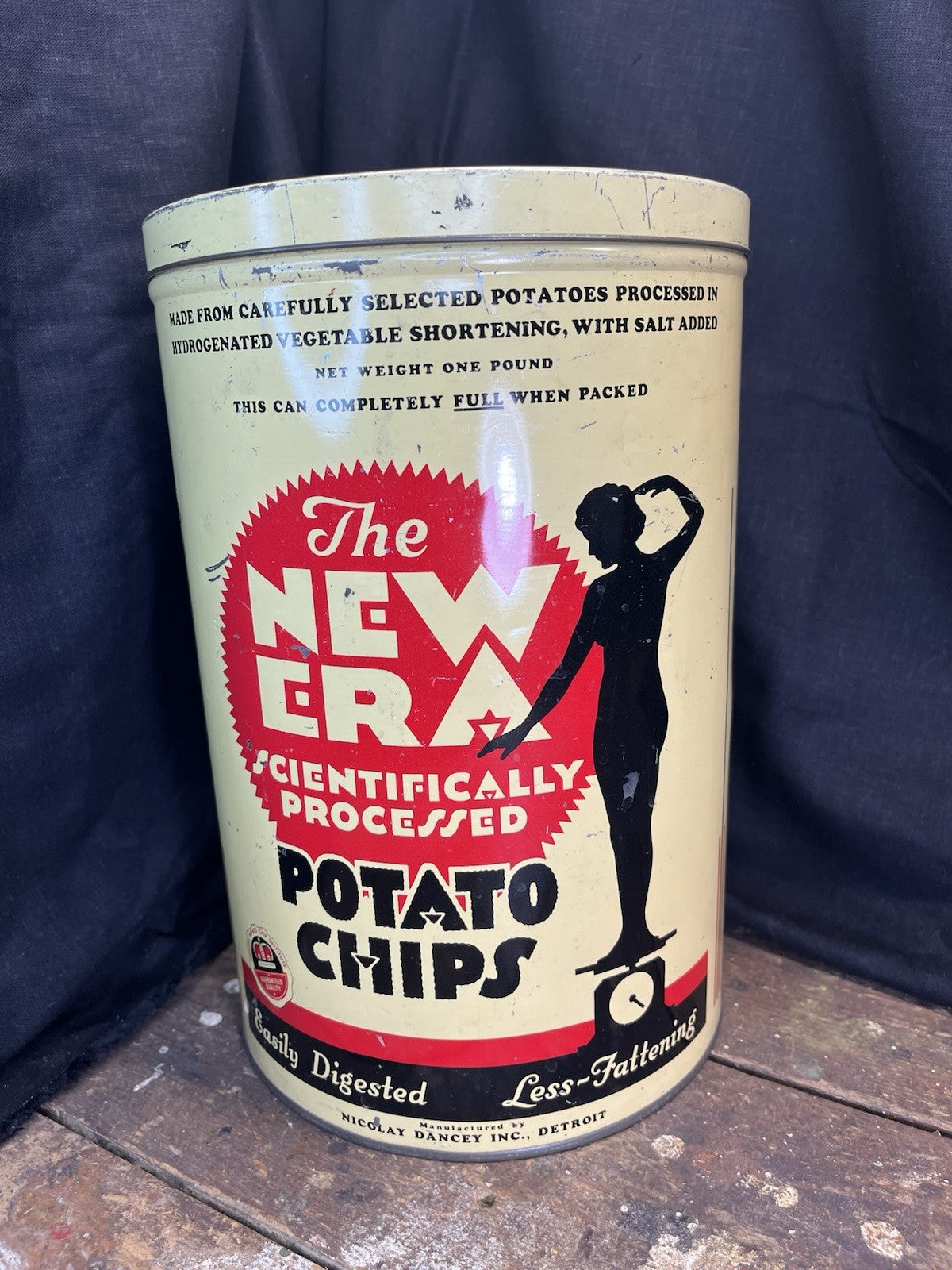 This vintage New Era Chip Tin is a colorful addition to any collection. With its vibrant multi-color design, it is sure to catch the eye of any collector. The tin is in excellent shape and is a great example of advertising merchandise and memorabilia from the past. It would make a perfect addition to any collection or a great gift for any vintage enthusiast. Check pics for condition